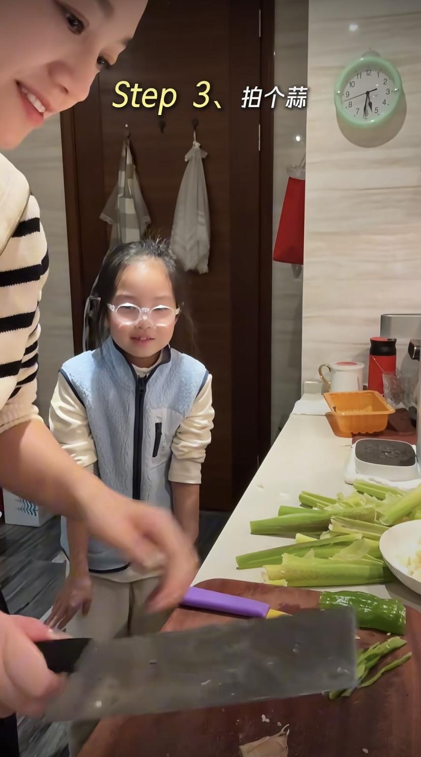 她們做的就是女兒最喜歡喫的油燜茭白,母女倆在廚房裏忙活,8歲的女兒乖巧可愛。朱丹和週一圍的女兒名叫周念如,已經8歲了。