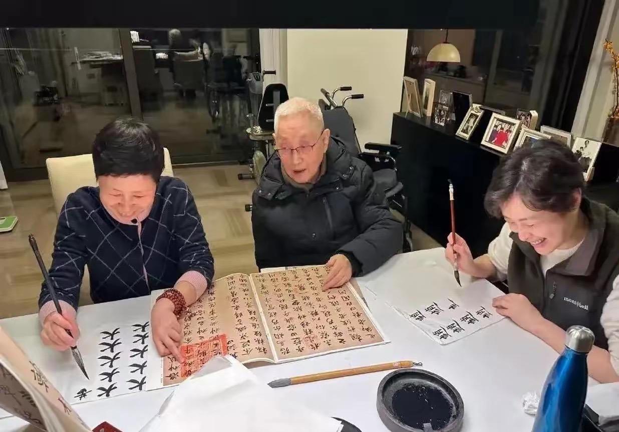一家人搬進大平層後,吳越也經常陪伴父母。他們圍在書桌上練字,84歲的父親作爲指導,時不時的提出幾句點評,有說有笑的也很開心。