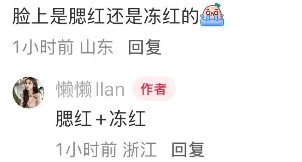 她的臉看着通紅,粉絲有點心疼的問,是被凍的還是腮紅?想要拍美照,懶懶必然是化過妝了,那麼紅撲撲的臉蛋就是腮紅+凍紅,懶懶很直白、有一說一從不藏着掖着。