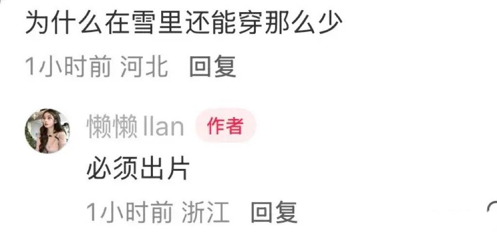 不少粉絲直白的問懶懶,爲什麼在雪地裏還能穿那麼少。懶懶回答“必須出片”!出片是必須的,賣衣服是她的事業。這個女孩子聰明果敢,即便傍上了王思聰,也沒有放棄自己的工作。