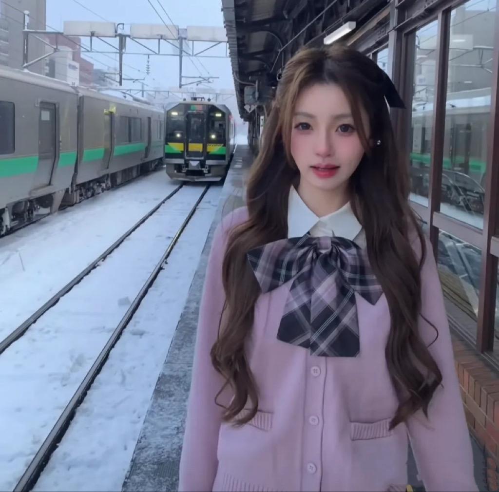 穿香芋紫的針織衫、白襯衫,同色系百褶短裙,儼然是學院風的打扮。長髮披肩,就連頭髮絲彎曲的弧度都剛好修飾出柔美的臉部線條。