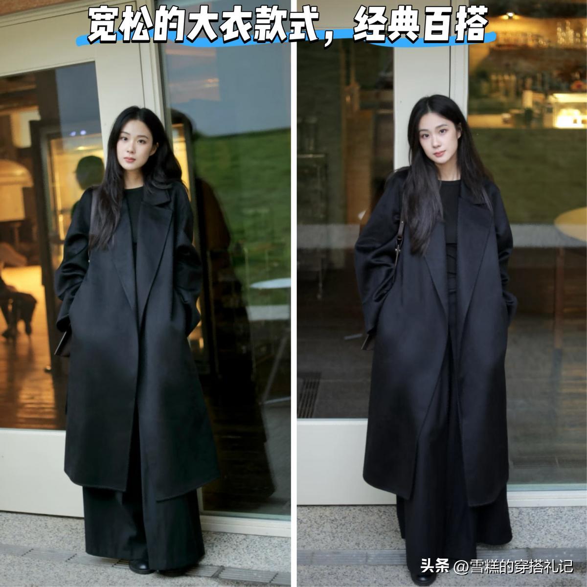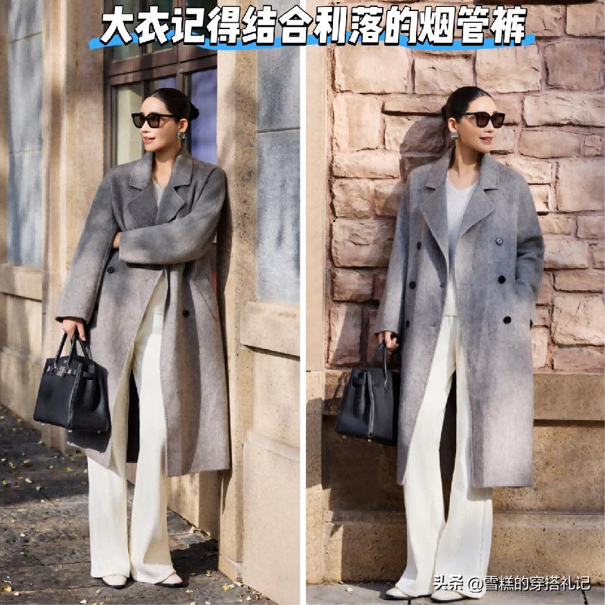 先來看一下大衣這款單品和小腳褲的組合,當真是屬於非常土氣難看的存在,而且也容易暴露腿部線條的不足,整體造型缺乏層次感與時尚張力,小腳褲本身收口設計容易卡在腳踝處,形成視覺斷裂,破壞全身比例協調性,尤其對小腿偏粗或腿型不直的人羣極爲不友好。這種搭配不僅削弱了大衣的廓形優勢,還讓整體風格趨向沉悶老氣,難以凸顯現代女性所追求的利落與氣質並存的穿搭需求。