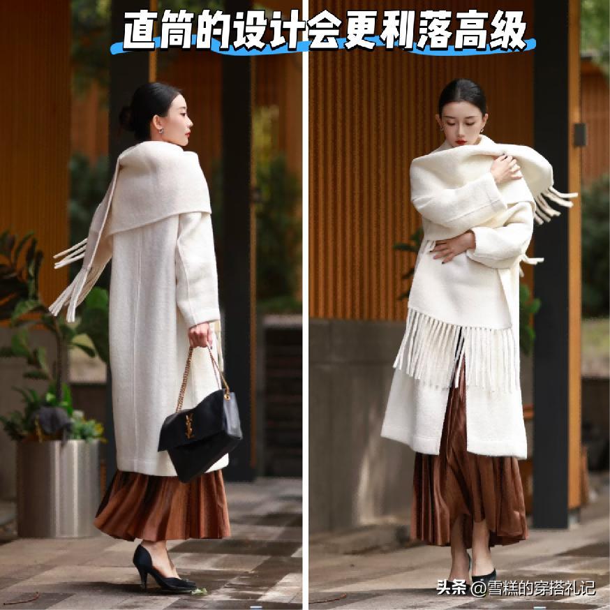 大衣可以結合優雅簡約感的長裙作爲內搭哦,不少的女藝人和時尚博主在秋冬季節的時候都非常喜歡將大衣+長裙的組合運用,以此來呈現高級優雅的溫柔感效果,而且兩者都是長款的設計也不用擔心單品對於身材狀態的修飾會不好,起碼身形的輪廓和線條的走向是有的。