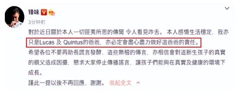 針對這些謠言,謝霆鋒也多次出面闢謠。他強調:本人感情生活穩定,只是Lucas和Quintus的爸爸。很明顯他不是張柏芝三胎兒子張承禮的父親,那麼張承禮的父親到底是誰呢?