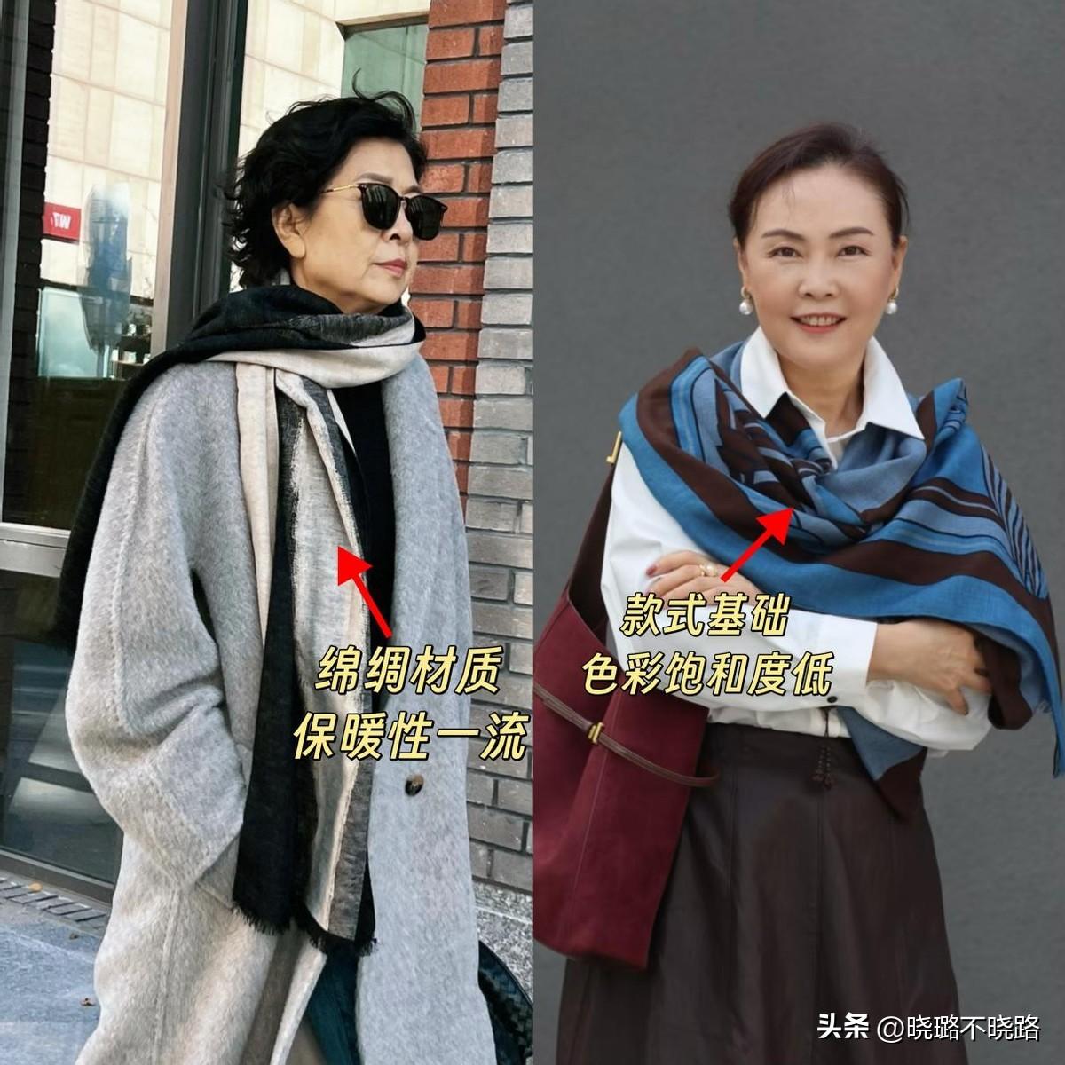 於中老年女性而言,想要藉助絲巾提升氣質,就要放棄設計複雜、材質廉價的款式,換成簡約有檔次的款,方可有效的排除油膩感。
