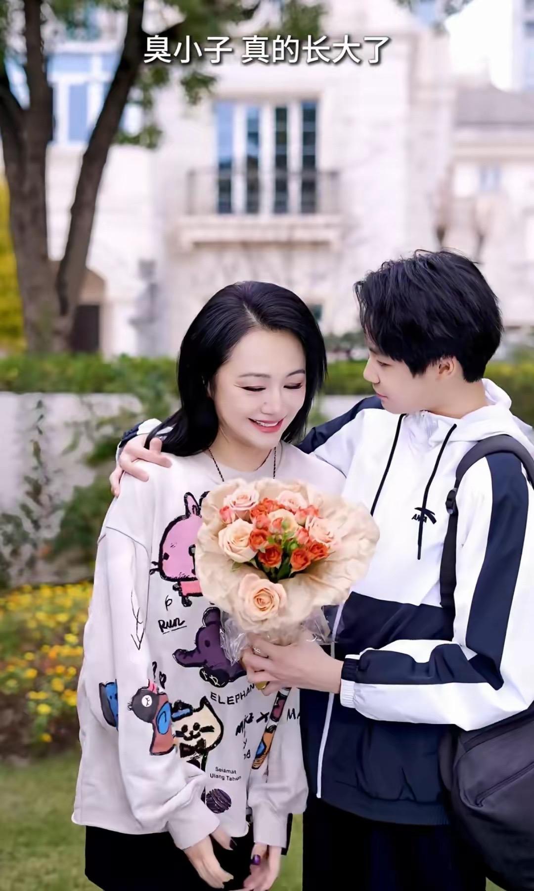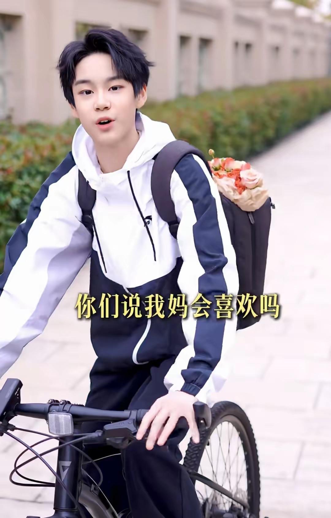 騎着自行車,把鮮花藏在書包裏,送給自己的媽媽。小王子真的好暖心,看到兒子送的鮮花、曹穎感動得流淚。