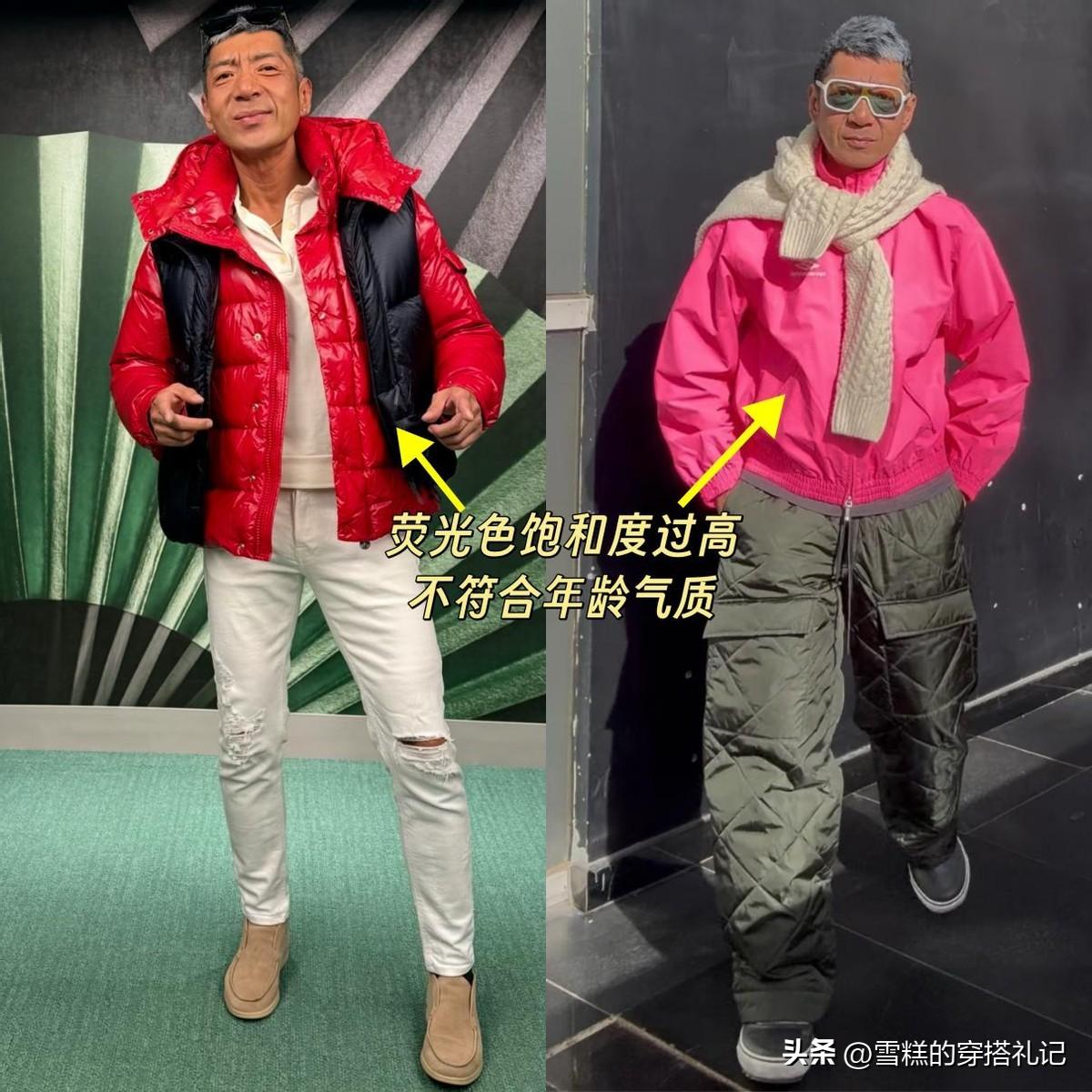 男人一旦到了五六十歲的年齡階段,穿衣就要走沉穩、紳士、清爽的路線,像這種飽和度非常高的大紅色,自以爲穿在身上顯年輕,實際上油膩又老土,違和感瞬間撲面而來。
