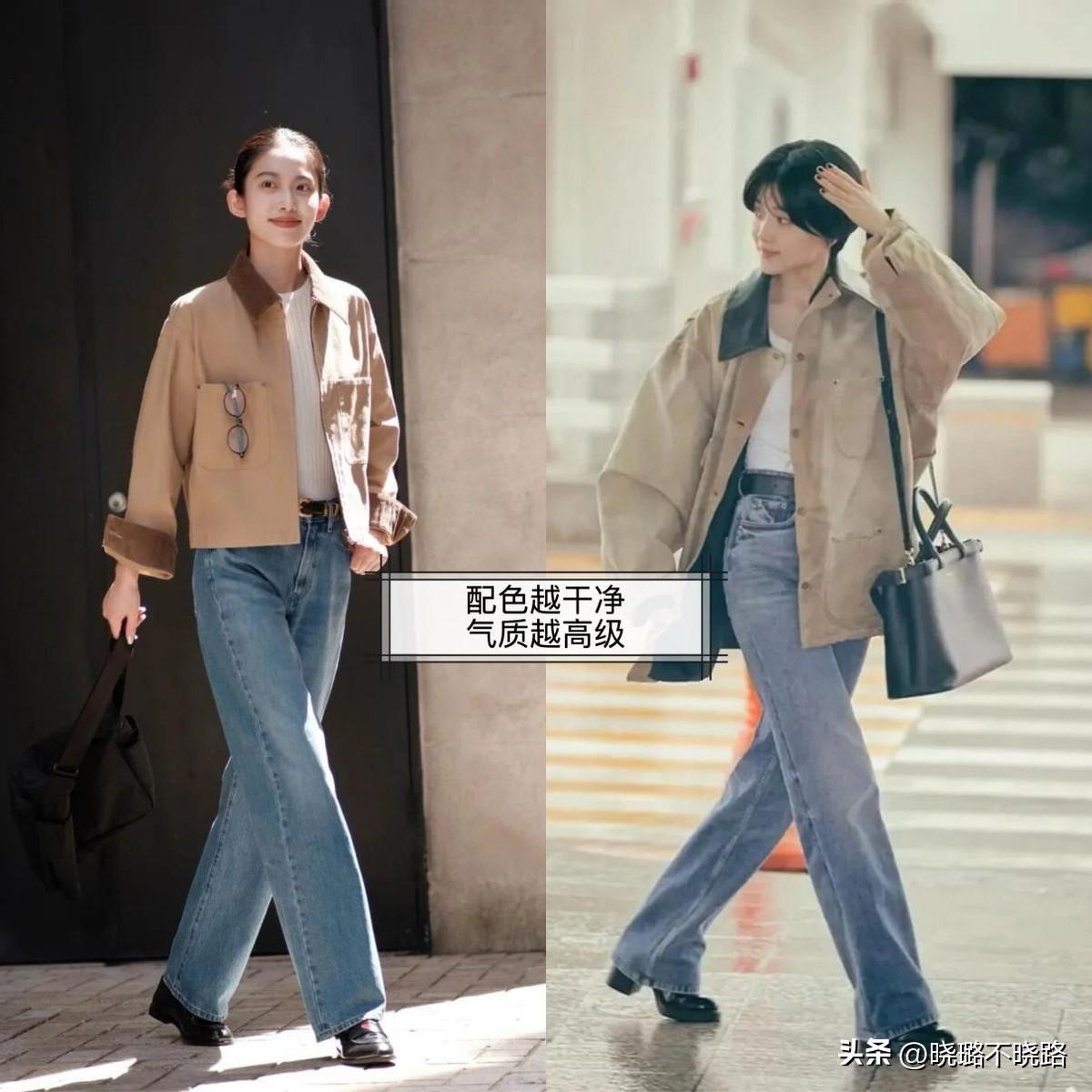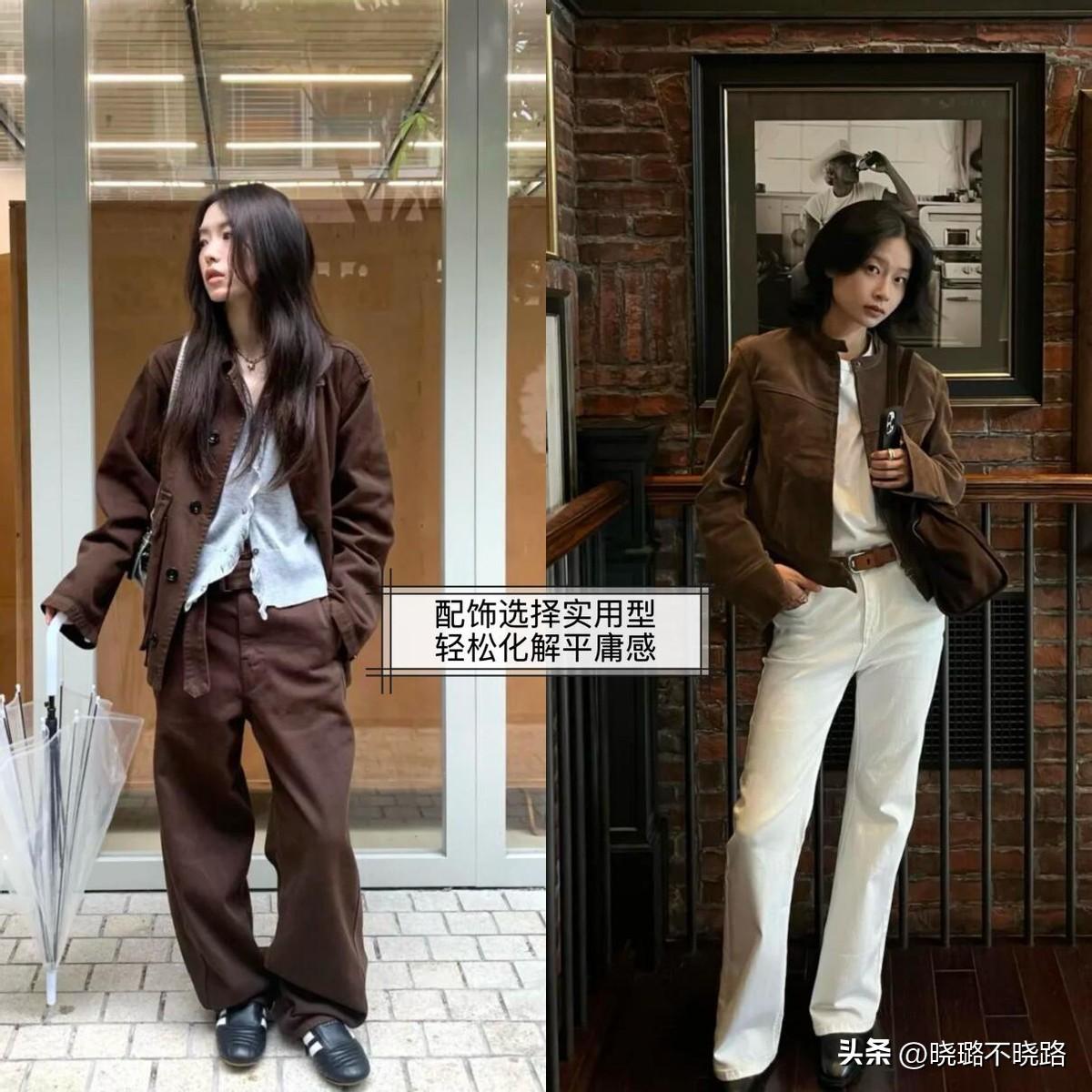 尤其是穿棕色系夾克外套的時候,可以用白色、淺藍色、杏色進行過渡,這些顏色適配於各種內搭,可以輕鬆穿出高級,擁有不費力的好氣質。