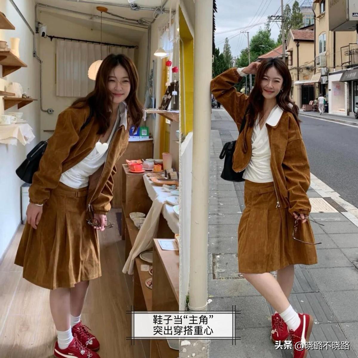 鞋子雖然是最終出場的單品,但是照樣也能當成“主角”,棕色套裝裙疊穿翻領襯衣,就很適合配雙紅色德訓鞋,用色彩傳遞個人魅力,解鎖時尚真諦!