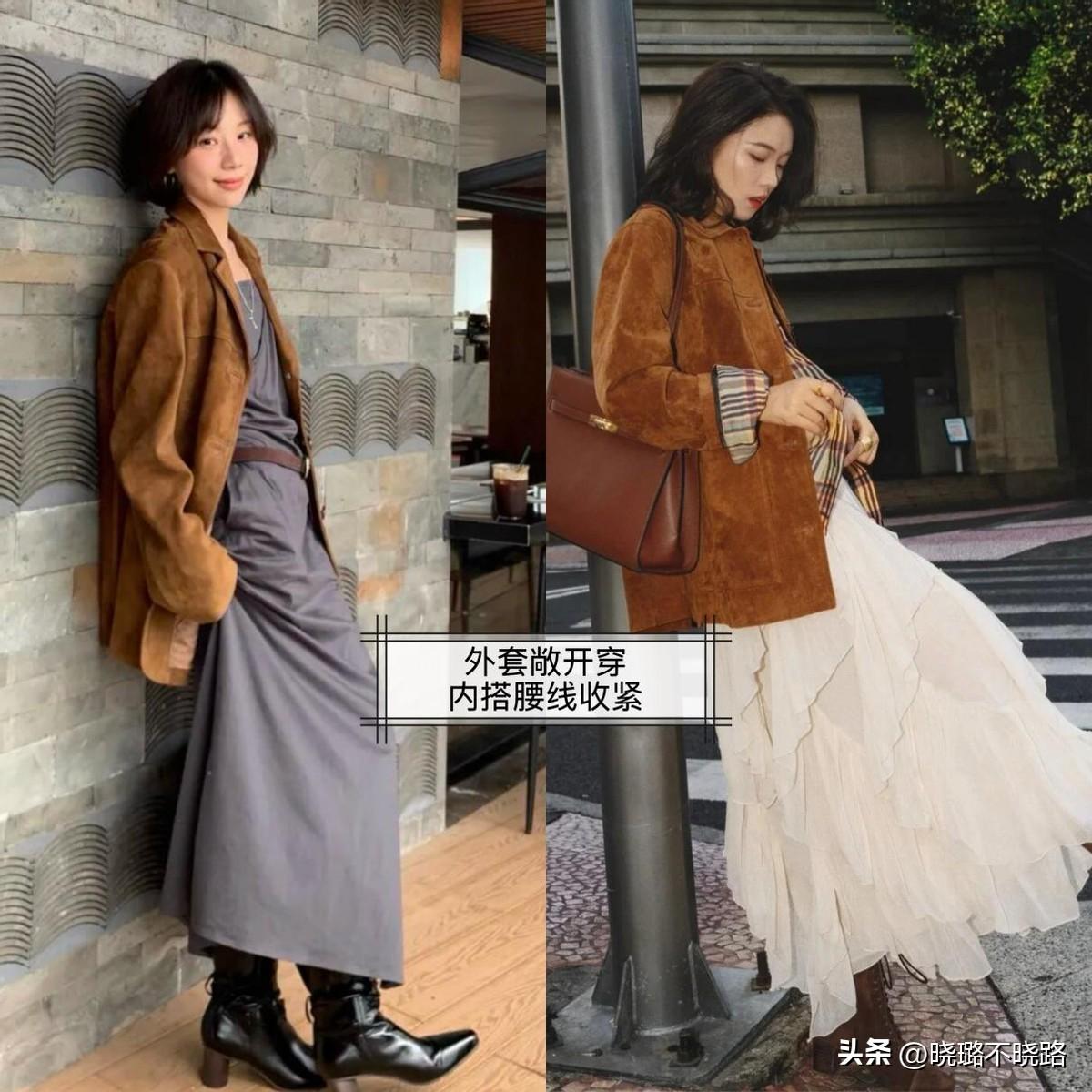 在麂皮外套裏面,可以疊穿一件吊帶連衣裙,腰線位置收緊,視覺上更顯瘦,裙襬微微散開,氛圍感直接拉滿,鞋子建議可以選擇低跟款式,悄悄的達到增高的效果。