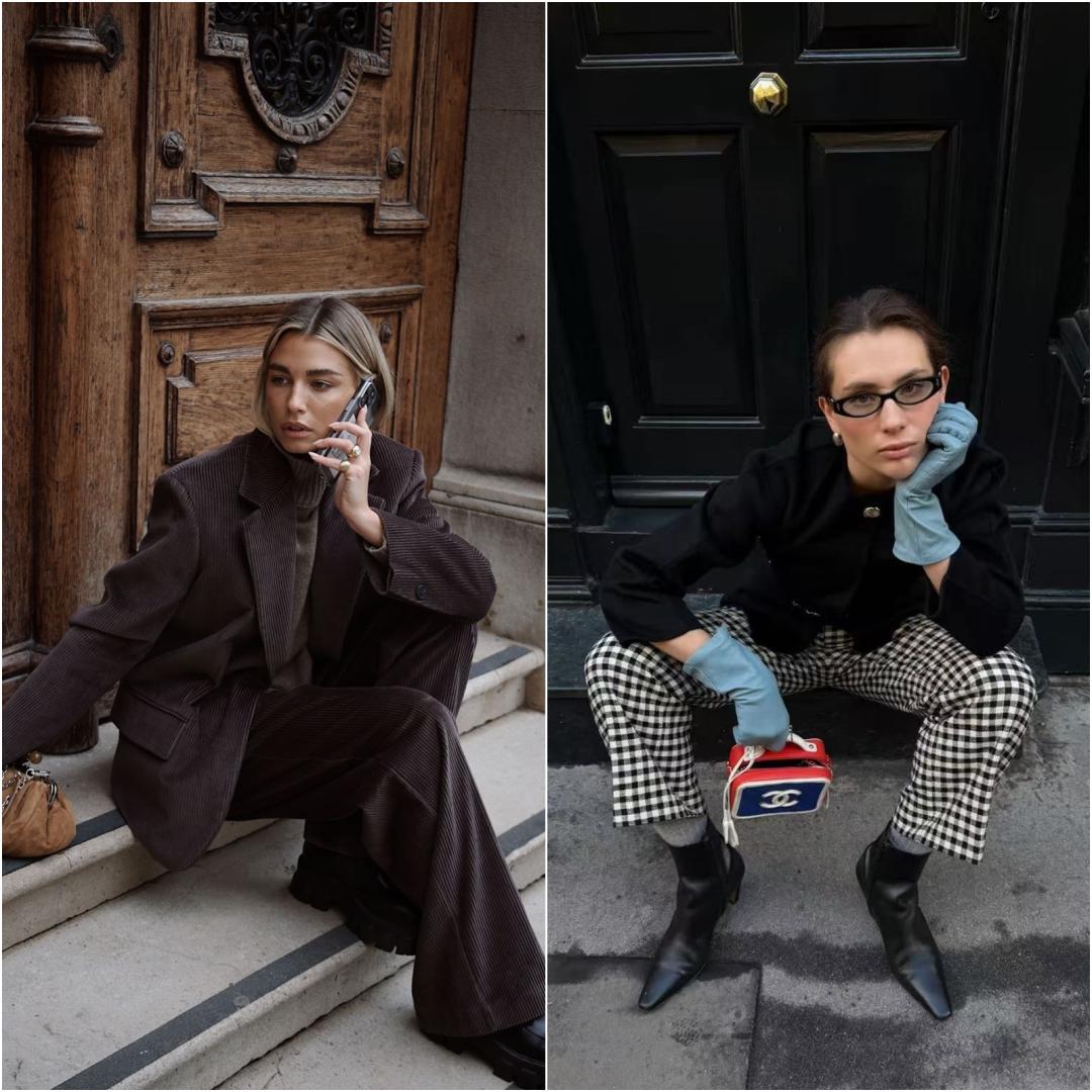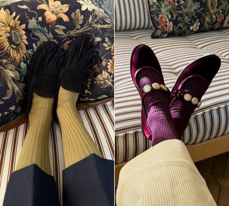 進階一點的話,特別推薦大家用麂皮、絲絨鞋來玩撞色,選薑黃色、紫色等復古色,效果絕佳~▼