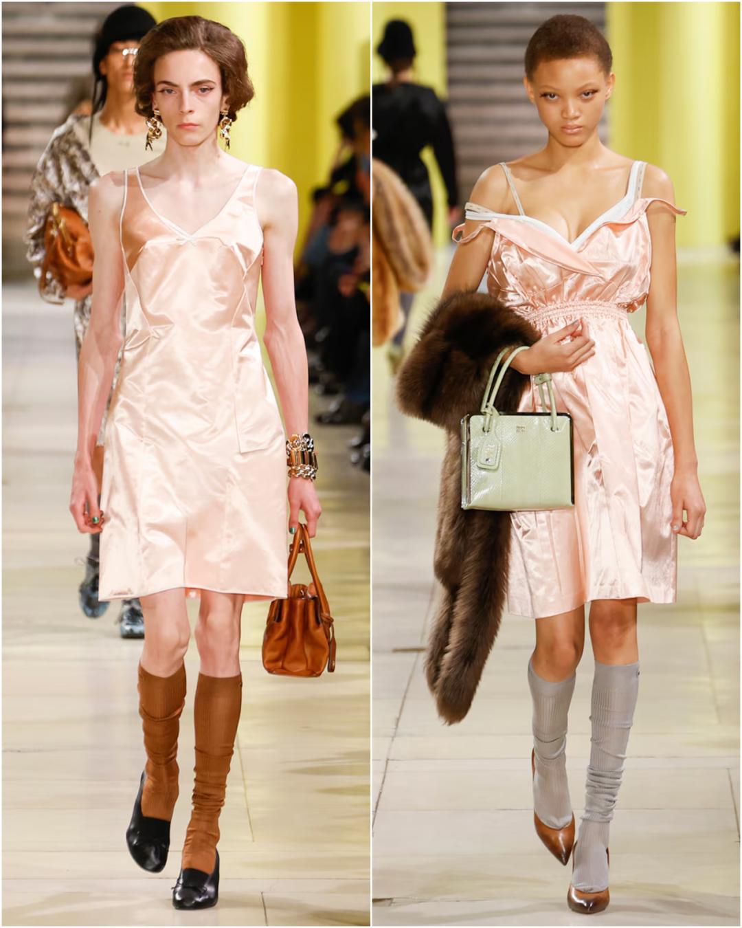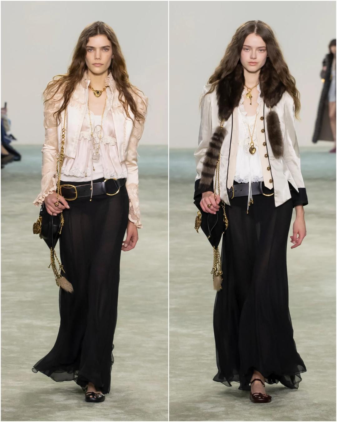 它對風格的改變是非常 霸道 的,Chloe和Miu Miu表示:哪怕你穿着“睡衣”,只要披上它,也能一下子從家裏瞬移到晚宴上。對比一下,左邊造型沒有皮草,右邊加了皮草,風格就產生了微妙的變化。▼