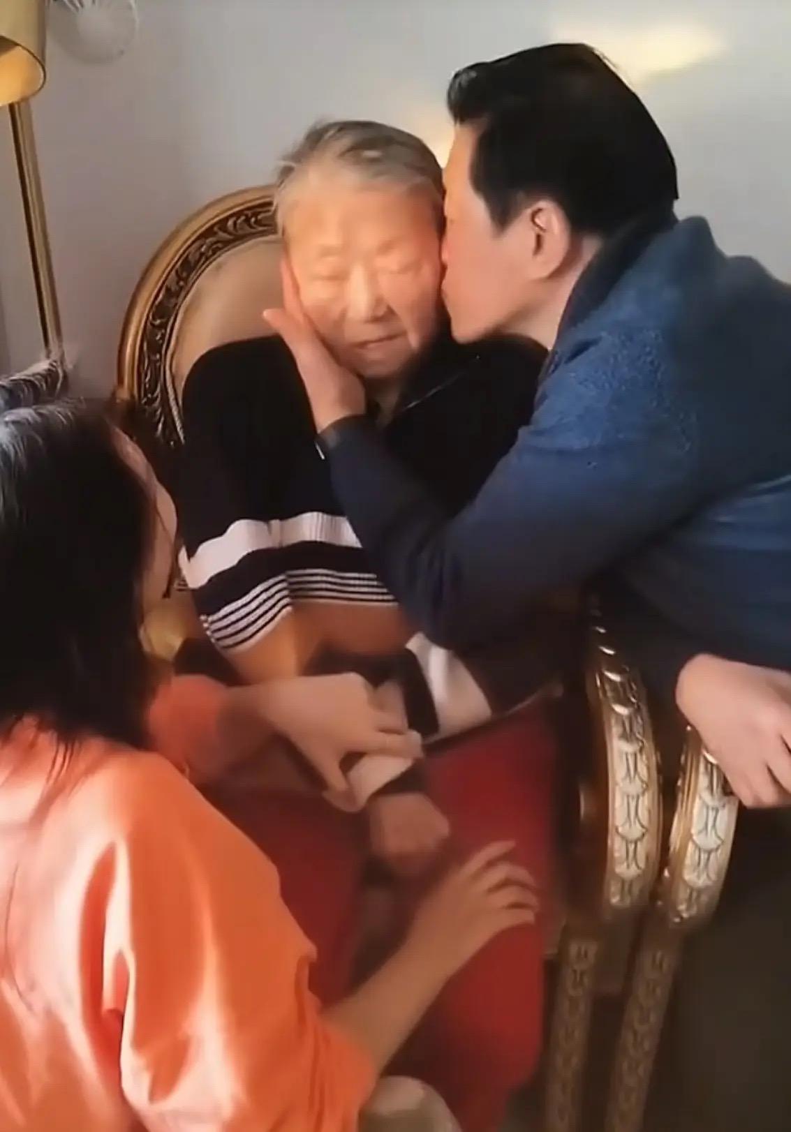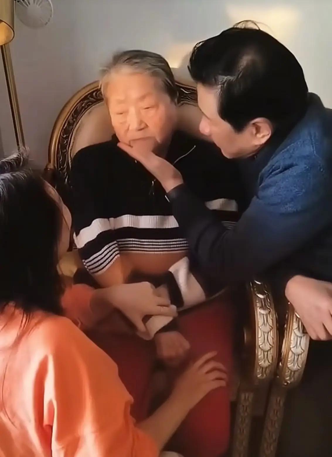67歲丁勇岱回鄉探母,給老媽喂水果還親她臉,母親行動遲緩很無力