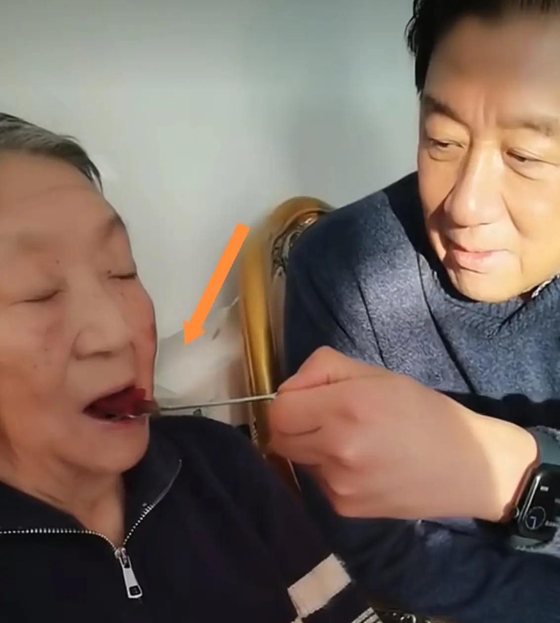 丁勇岱用小勺把水果挖出來,小小的一塊遞到母親嘴邊。他細心的照顧着母親,整個過程都很細心,講話和動作特別溫柔。