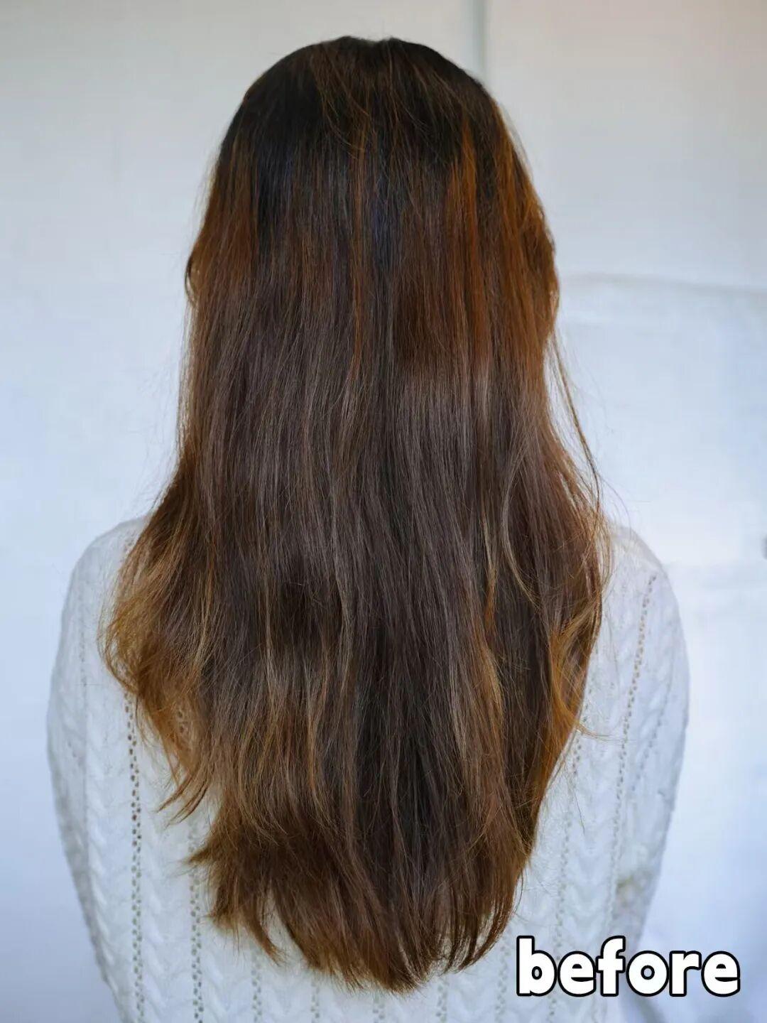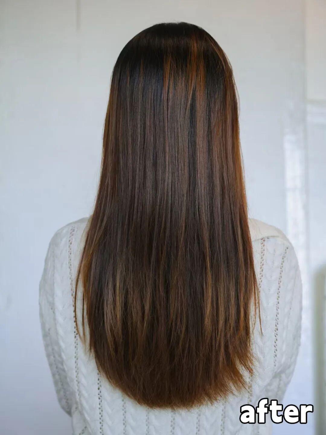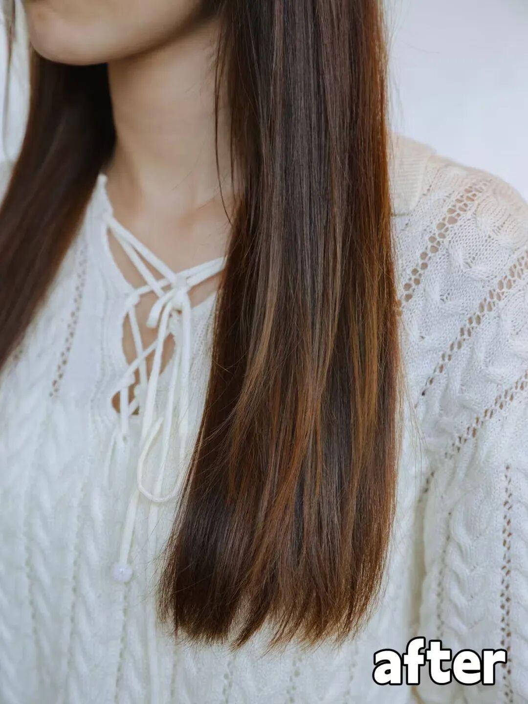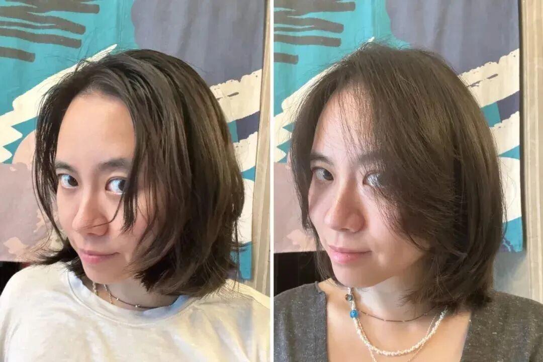 35+、愛熬夜、容易出油的PM用了很久,特別滿意,還拍了對比圖:右邊是她在家單用這款洗髮水吹乾梳順的效果(沒做任何造型)。▼