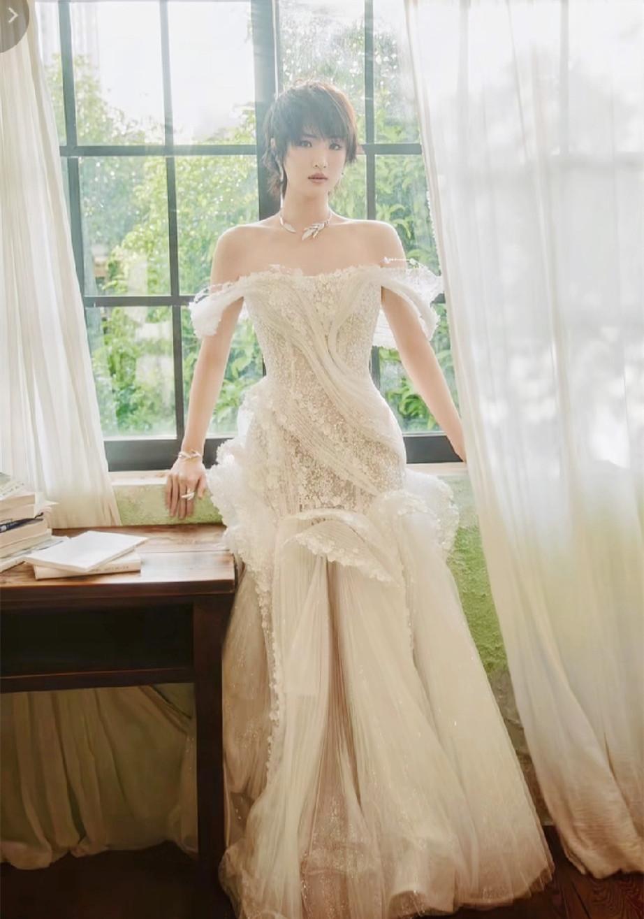 這種上緊下松的設計,既避免了一字肩造型可能帶來的單調,又平衡了整體視覺效果,使得造型既有少女的浪漫,又有成熟女性的氣場。