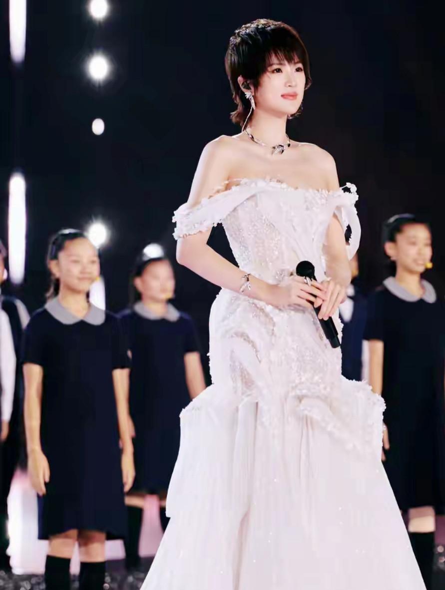 在衆多造型中,姚安娜的一字肩白色連衣裙造型堪稱經典。裙身採用流水線型設計,線條流暢如行雲流水,將肩頸曲線完美勾勒,盡顯天鵝頸與直角肩的優勢。裙身點綴的水晶設計尤爲點睛,燈光下,水晶折射出萬千光芒,如 “皎皎白駒,在彼空谷”,仙氣飄飄。
