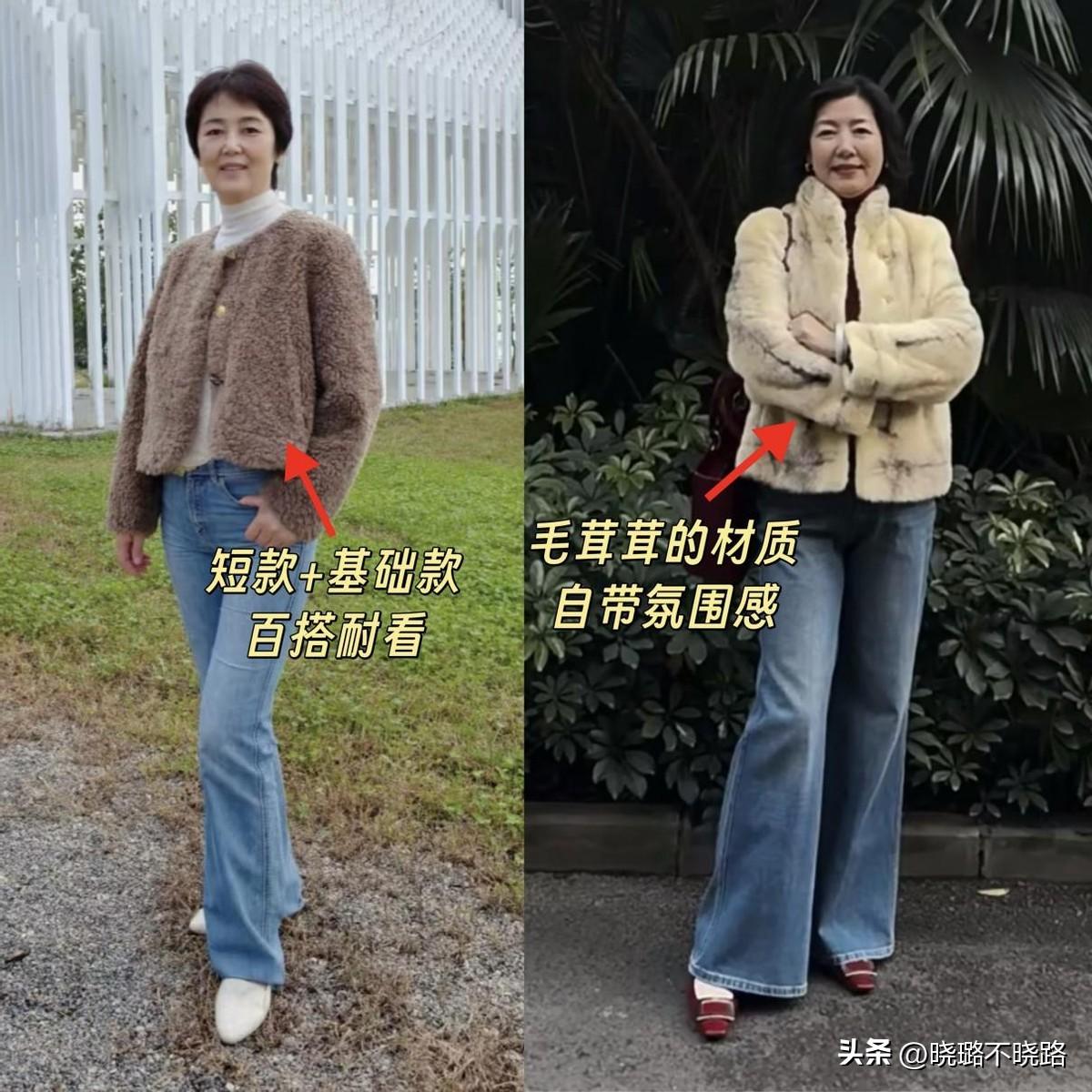 中老年女人穿毛絨外套,最基本的搭配核心就是“平衡蓬鬆感”,避免造型顯得臃腫,像這種短款的毛絨外套,是最百搭的,而且很適合小個子穿。
