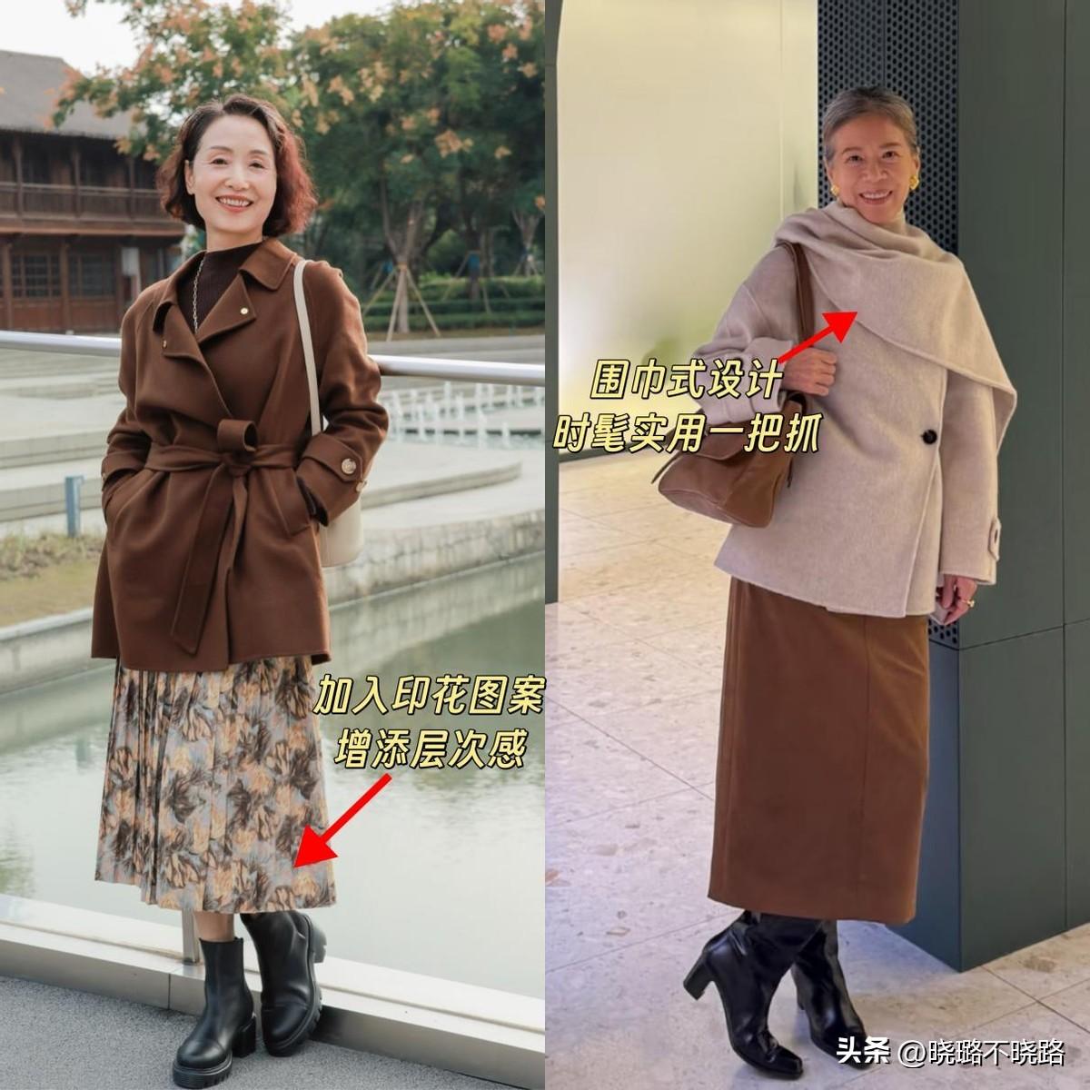穿搭講究一個“平衡感”,尤其是到了一定的年齡階段,不能再像年輕時那樣,隨意的搭配組合,有設計感的圍巾式大衣,更適合搭配純色直筒半裙。
