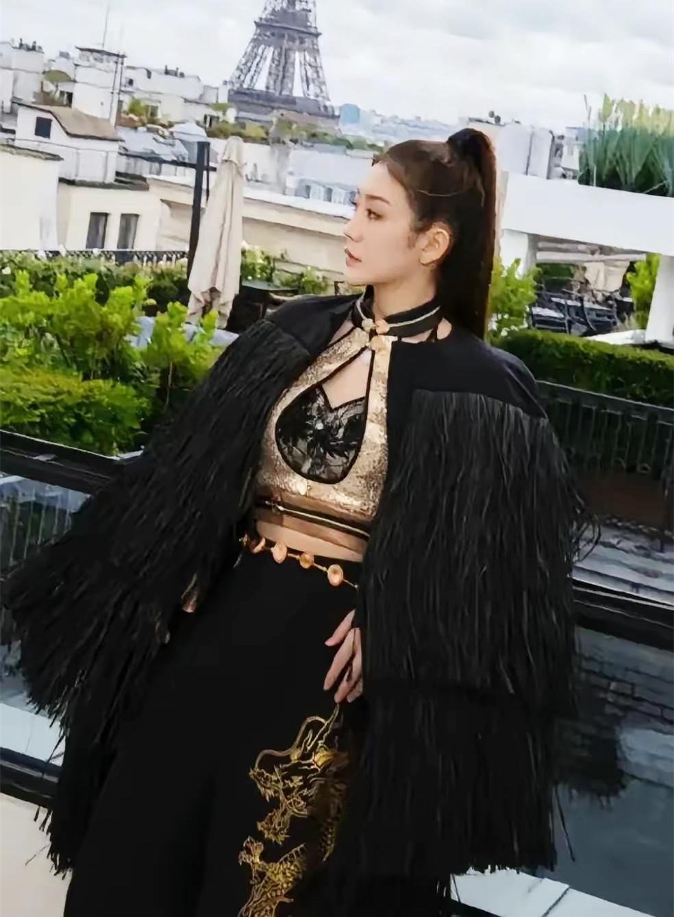 此次巴黎之行,她的國風造型驚豔衆人:金色肚兜式吊帶搭配國風裙裝,裙襬之上的精緻刺繡古韻悠長,行走間宛如從歷史畫卷中走出的佳人;更有大鵬展翅般的廓形設計點綴其間,將東方美學的溫婉與力量完美融合,既彰顯了國風韻味,又不失現代時尚感。