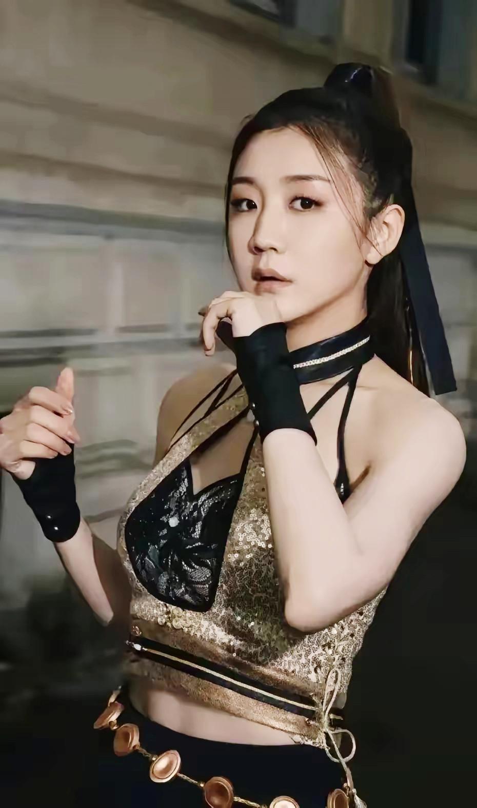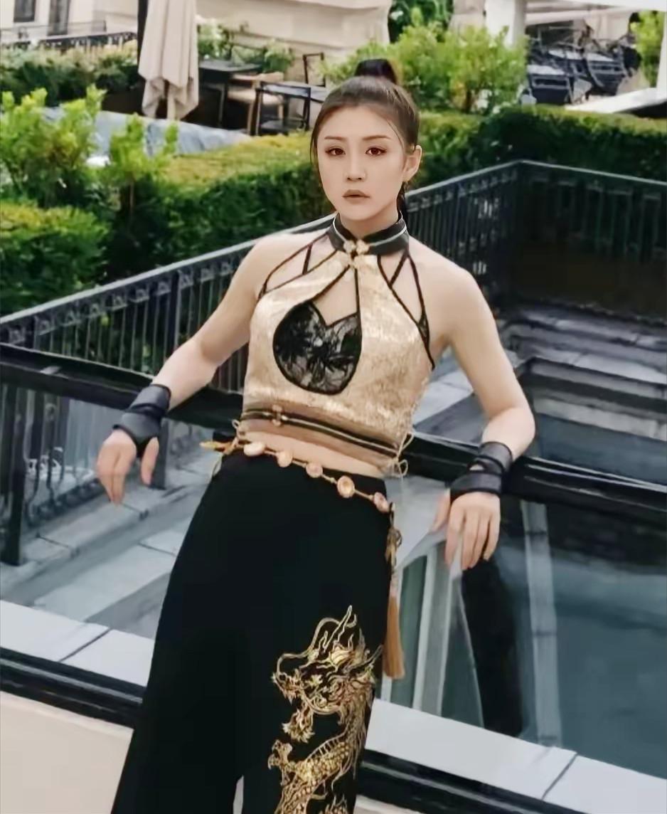 在一組國風寫真中,她身着金色肚兜式吊帶搭配國風裙裝,吊帶的簡約設計勾勒出優美的肩頸線條,裙身的刺繡工藝精緻細膩,花鳥紋樣栩栩如生。
