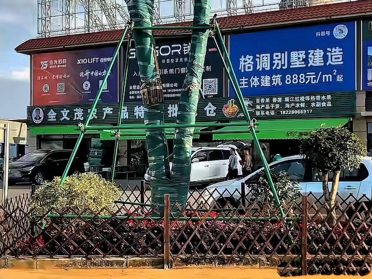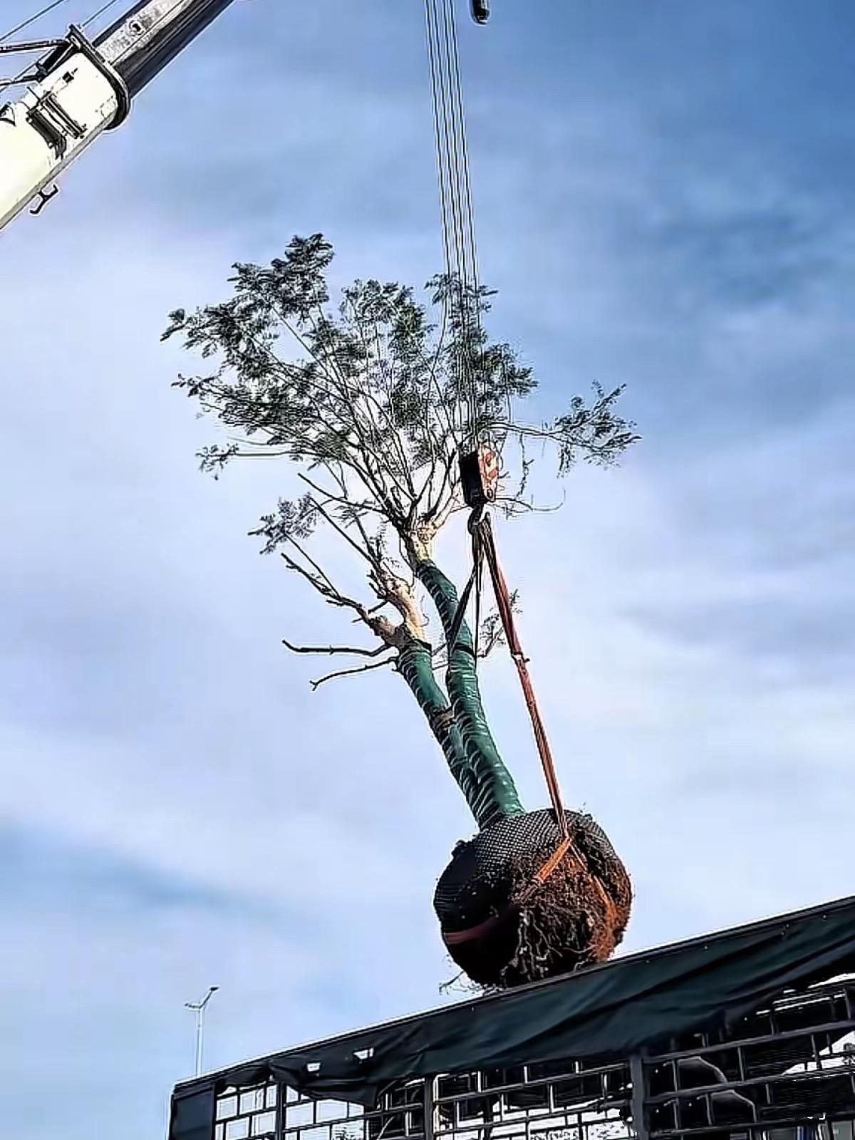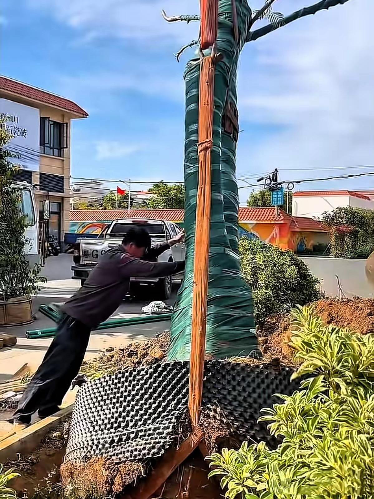 藉助吊車栽種,全紅嬋爸爸只需要看着把鳳凰樹栽到合適的位置就可以。要是放在以往全靠人力,想要移栽這麼大一棵鳳凰樹,非得累的人扒層皮。