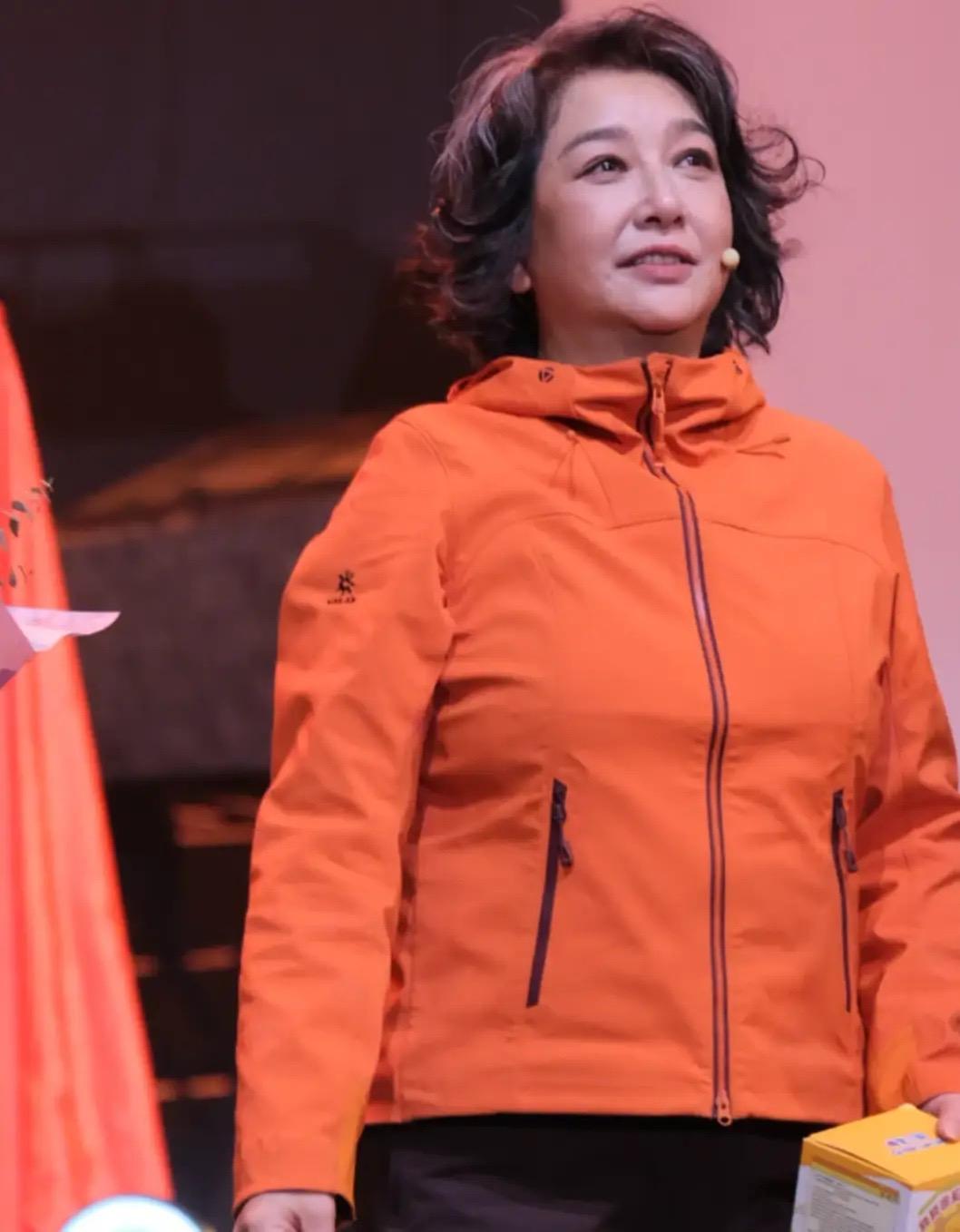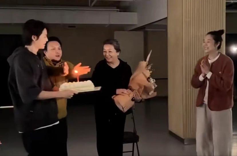 58歲江珊在劇組慶生,穿黑衣滿頭白髮體重超140斤,皺紋不掩美貌