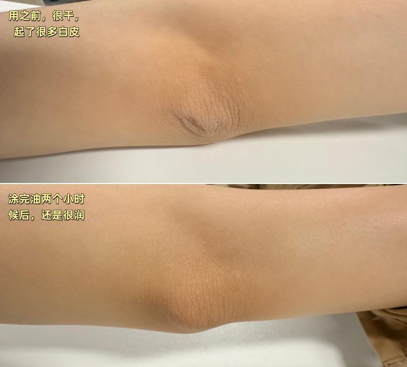 油軟化滋潤皮膚的效果很好。它完全吸收後會讓皮膚變得特別軟特別彈,皮膚的延展性變得很好。用實習生yeri幹到起皮的手肘做個例子~▼