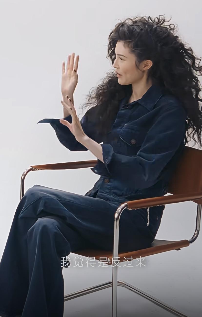 何穗穿一身牛仔衣,燙着爆炸頭,很摩登復古的感覺。