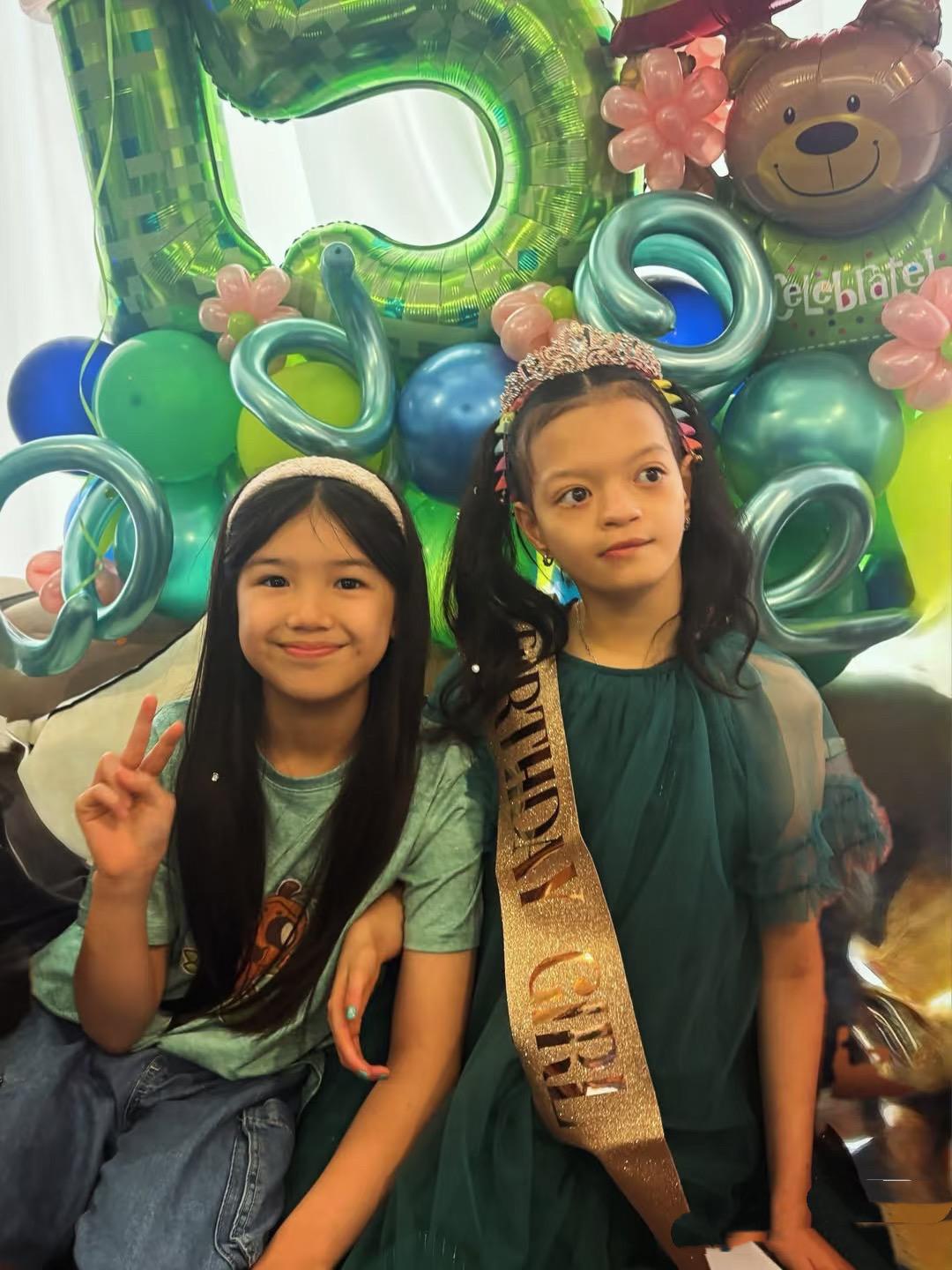 Isabella是小壽星,被打扮得很漂亮。扎着好看的小辮子,穿着綠色公主裙,就連生日場景都是綠深林款式的。