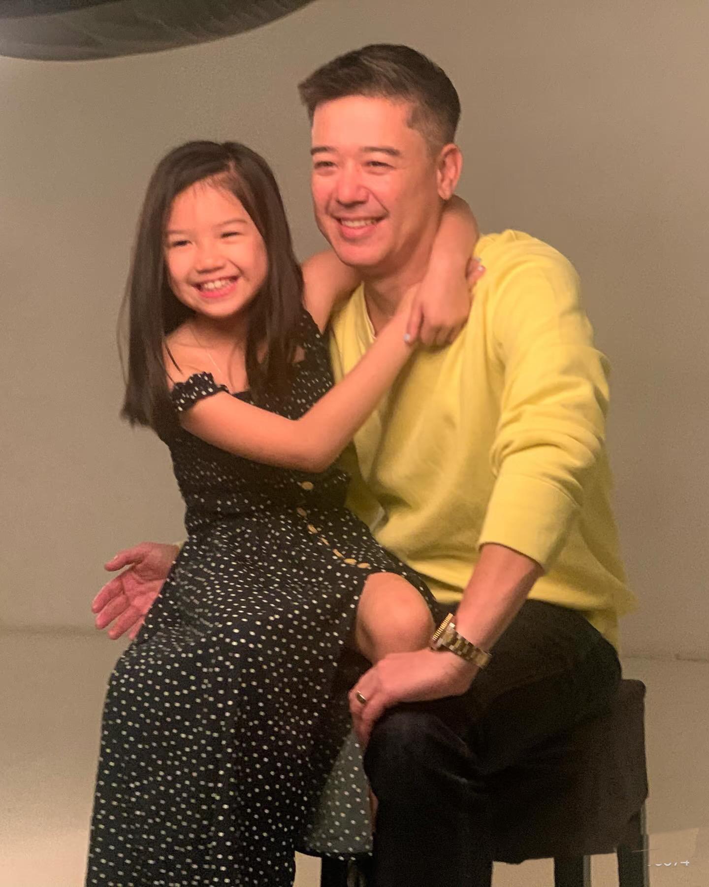 妹妹活潑可愛,習慣摟着爸爸的脖子,小姑娘拍照的時候穿了一條開衩的波點連衣裙,就是打扮的稍微成熟了點。