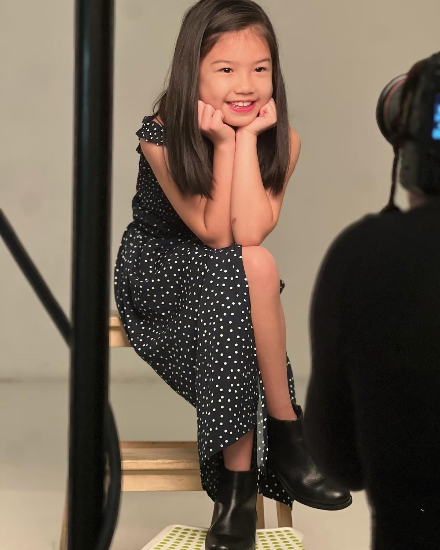 他們一起拍全家福,爸爸把妹妹扛在肩上、媽媽就抱起Isabella,還順手抓起美美的頭髮,畫面很搞笑。