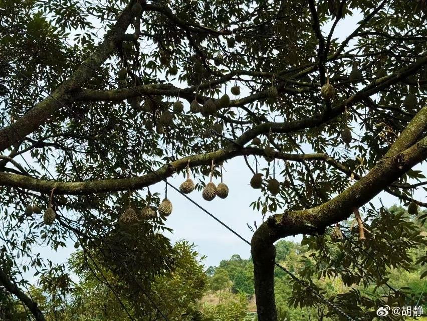 再看胡靜莊園裏的榴蓮樹,已經掛滿果了。幾百塊一個的貓山王榴蓮,胡靜家裏的樹上掛了上百個,這都是白花花的銀子啊。