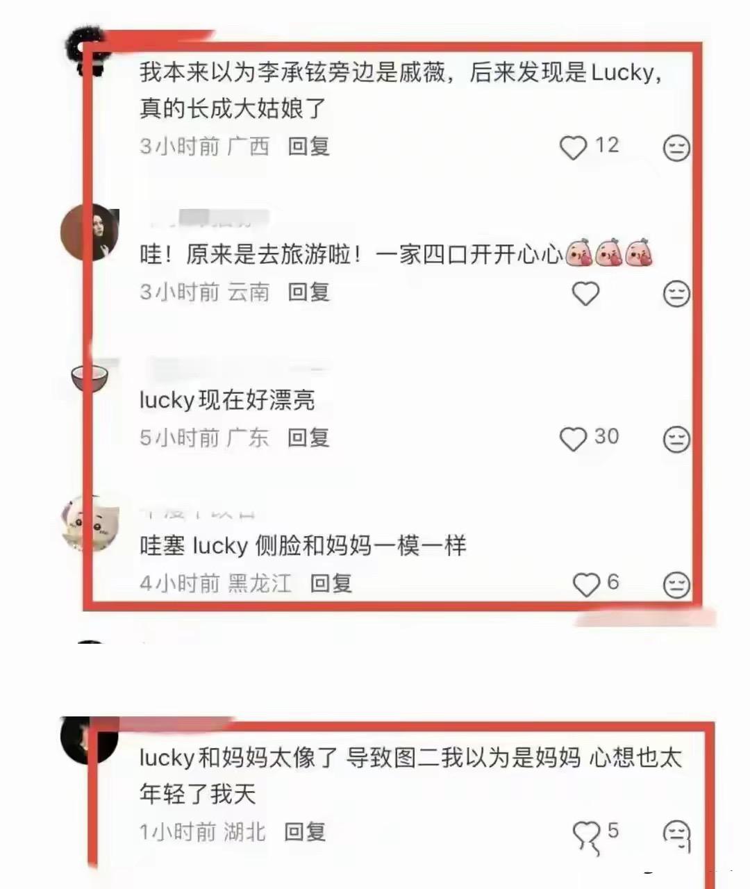 在新加坡遊玩的時候,網絡上還曝光了戚薇女兒的正面照。10歲的lucky長髮期間、身高接近160。只是臉上有少許肉肉,看着小臉變圓潤了,微笑起來的時候有點不自然。