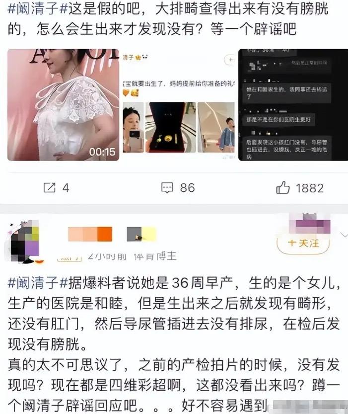 不敢相信,但爆料者說的有鼻子有眼。透露闞清子是在“和睦家”生的,然後轉運到新華醫院兒科。但是後面發現小孩沒有肛門、導尿管也插不進去、甚至沒有膀胱。