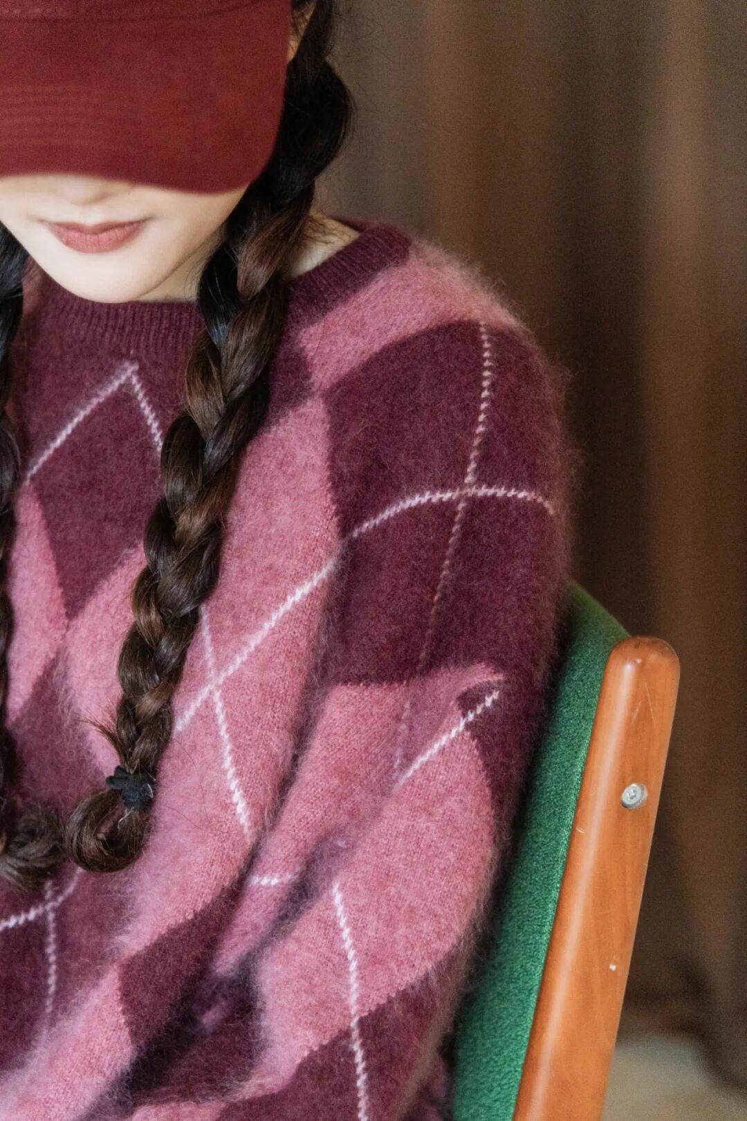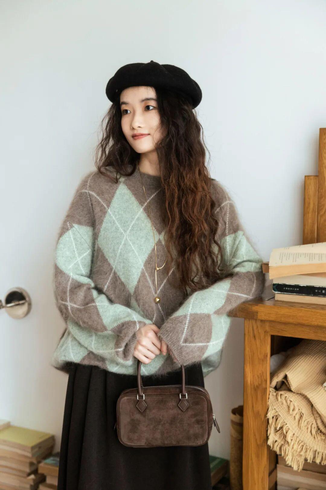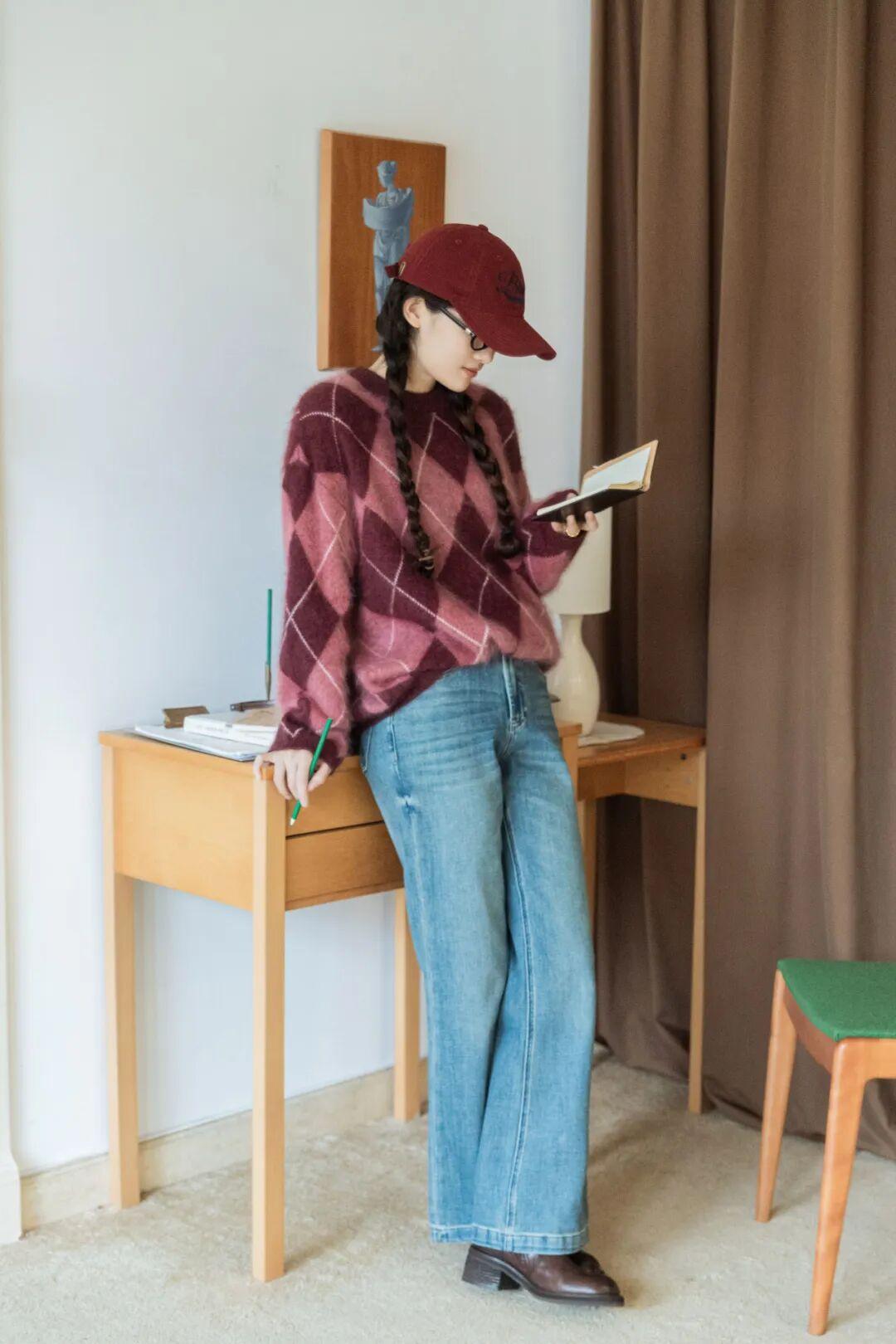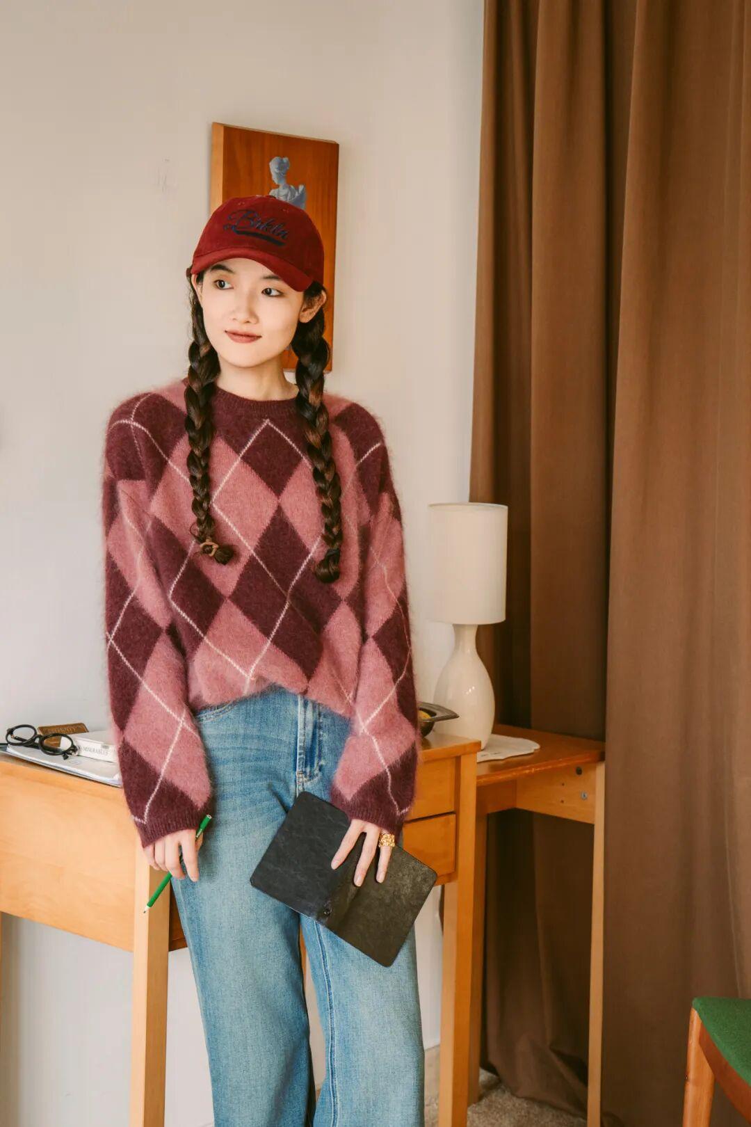 比起純色拉毛衫,菱格紋的加入,既保留了拉毛的軟糯慵懶,又多了幾分學院復古感,整體風格更休閒、溫柔,日常穿也很輕鬆。▼