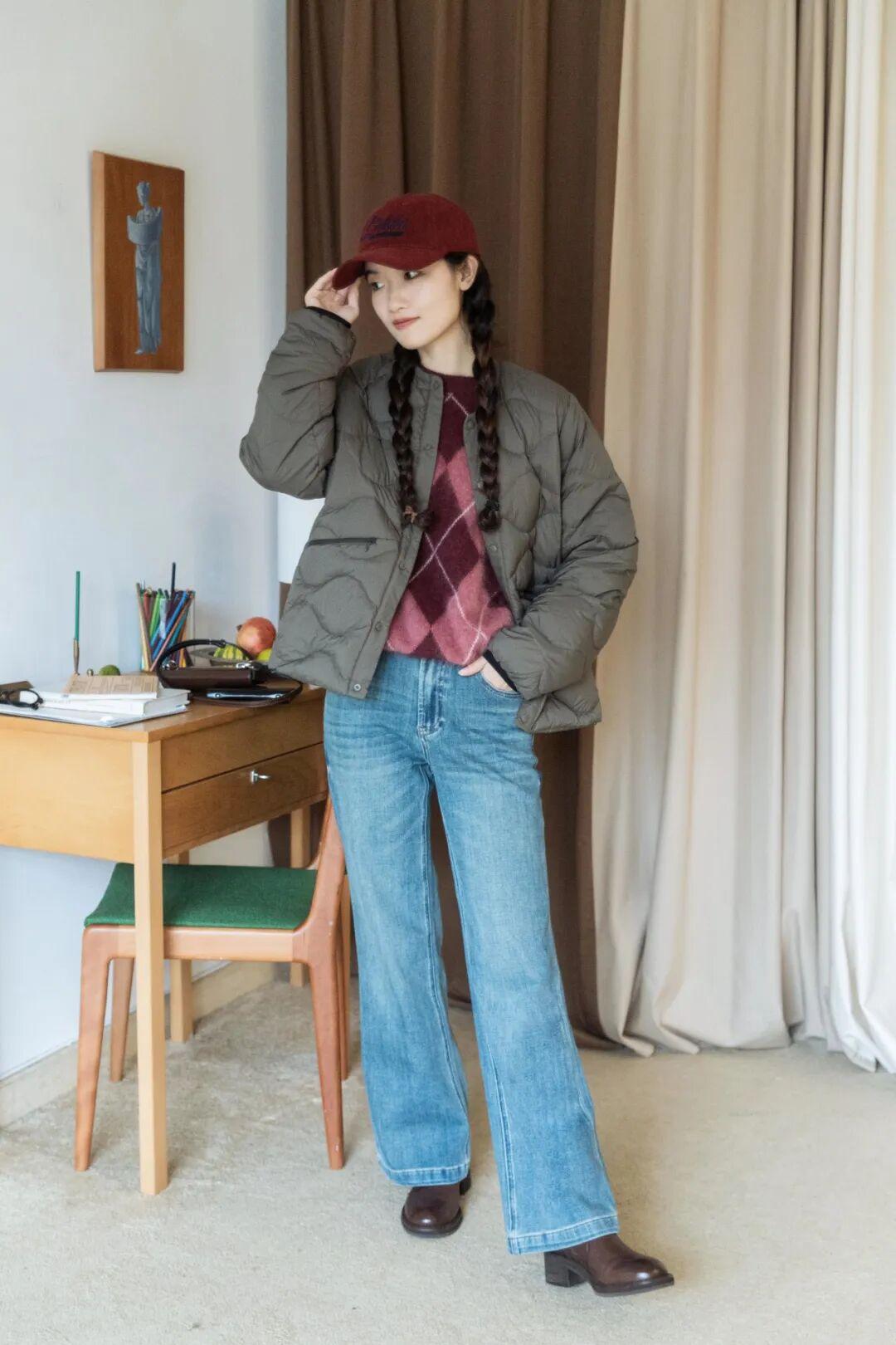 除了剛纔說的一體絨牛仔褲,還有今年很火的拉毛菱格羊毛衫、用了雁鴨絨的超輕羽絨服。▼