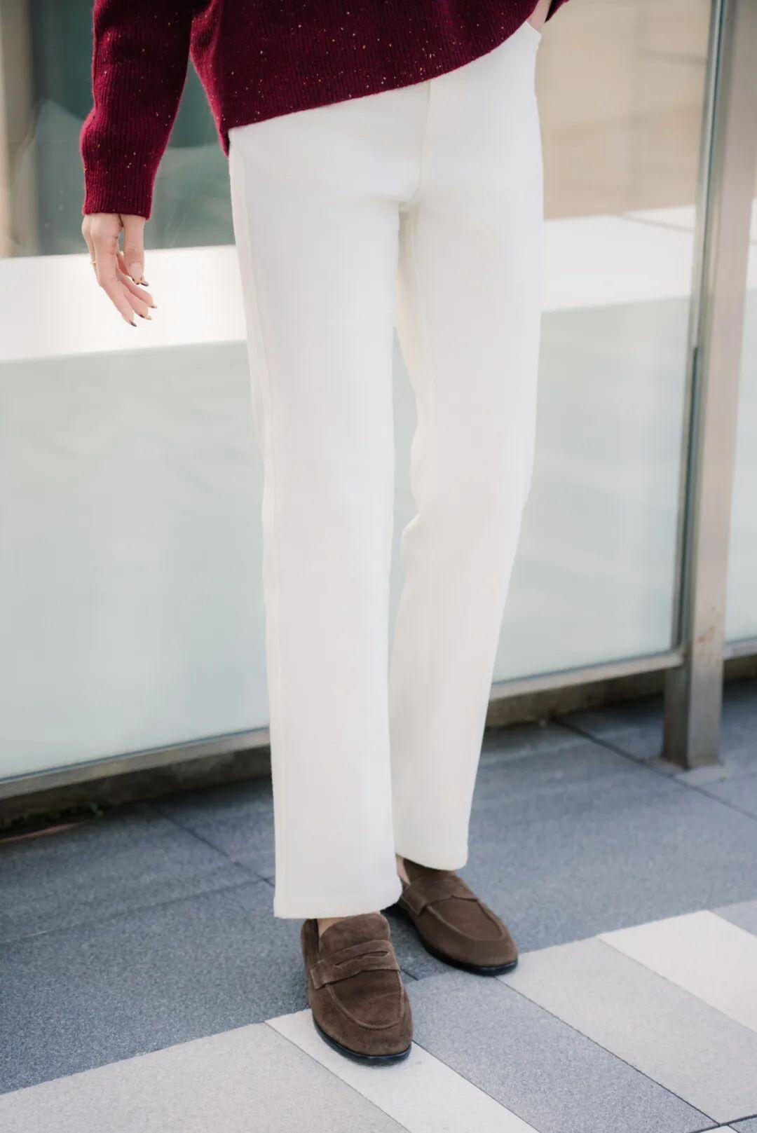 立體剪裁的煙管褲型,從大腿到腳踝漸漸收窄,視覺上顯得腿又直又細。