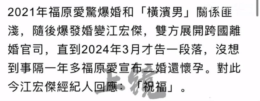 面對福原愛和橫濱男再婚再育的消息,江宏傑一直沒有公開回應。不過福原愛宣佈二婚懷孕後,江宏傑經紀人回應了“祝福”。