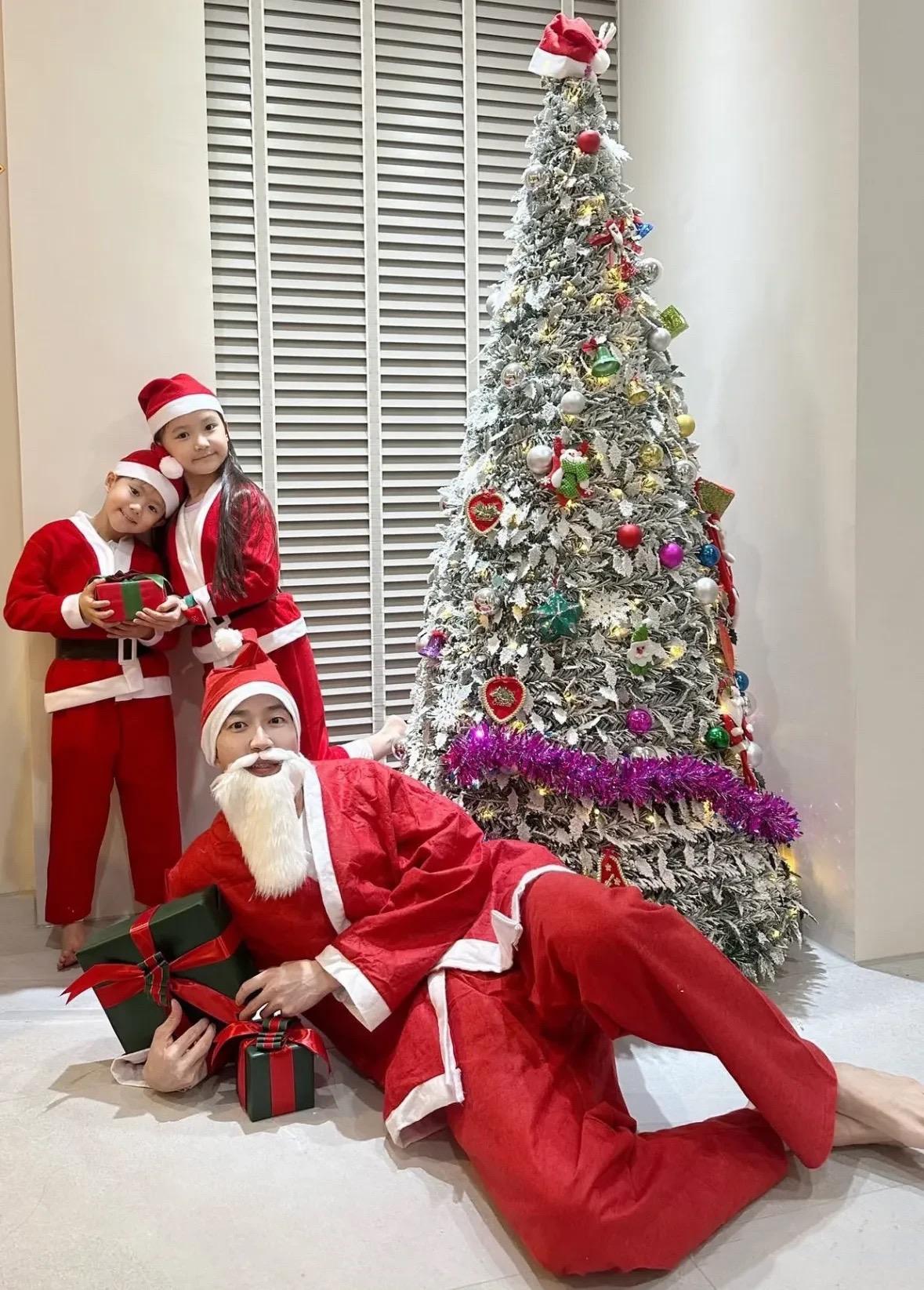 江宏傑和倆娃穿上紅色聖誕衣,在家裏點綴了又2米多高的聖誕樹,還準備了各種好看的禮物盒子。