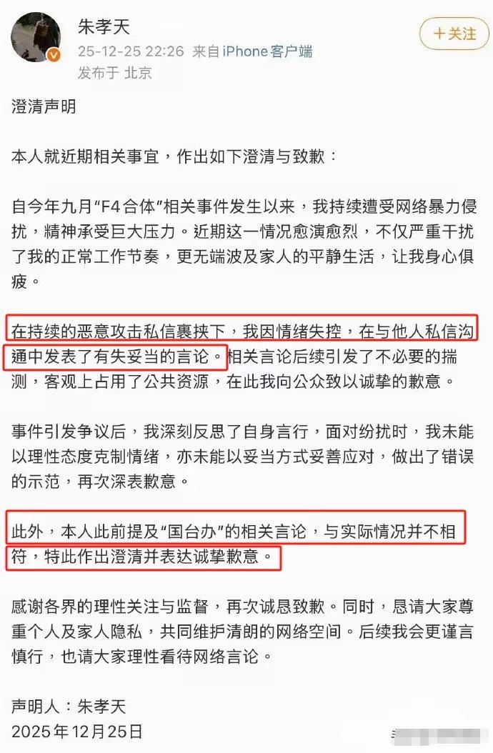 從朱孝天惡意抹黑阿信還不到24小時,他就髮長文道歉了。