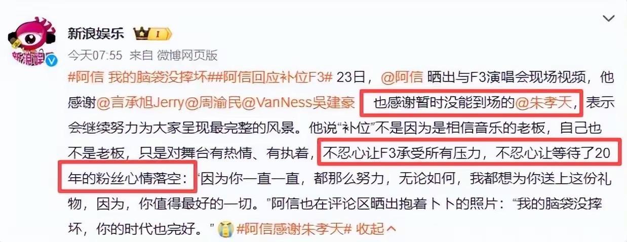 演唱會結束後,阿信感謝了F3成員,當然也特意提到了朱孝天,甚至對着歌迷們說“下一次爭取帶來你們想要的陣容”。