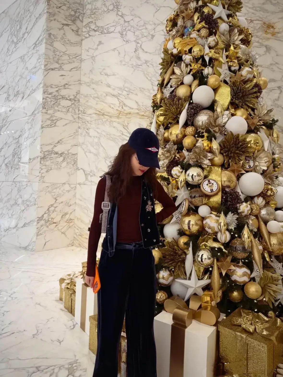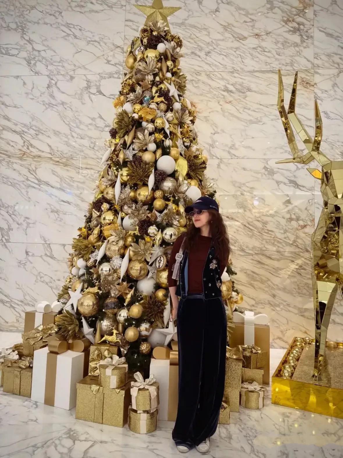 她戴上棒球帽、墨鏡,在聖誕樹前合影。這裏的聖誕樹都是金色的,充分彰顯出奢華的味道,不愧是60萬一晚的酒店,就連聖誕樹上都散發着金錢的味道。