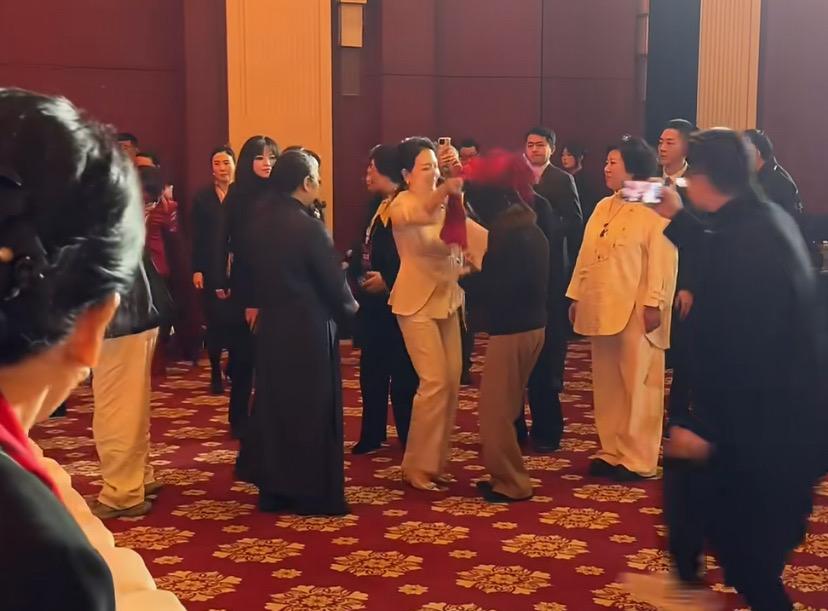 來到大廳,何超瓊被熱情的接待。還有工作人員準備了紅色圍巾,何超瓊彎腰接受贈予,她很平和、以前都沒架子。給人一種特別溫和、接地氣的感覺,不那麼高高在上。