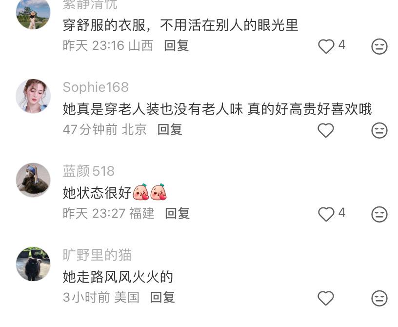 她真實自信,從來都不活在別人的眼光裏。穿很舒服的衣服,也不踩高跟鞋。真的是穿老人裝也沒有老人味,很高貴內斂的感覺。