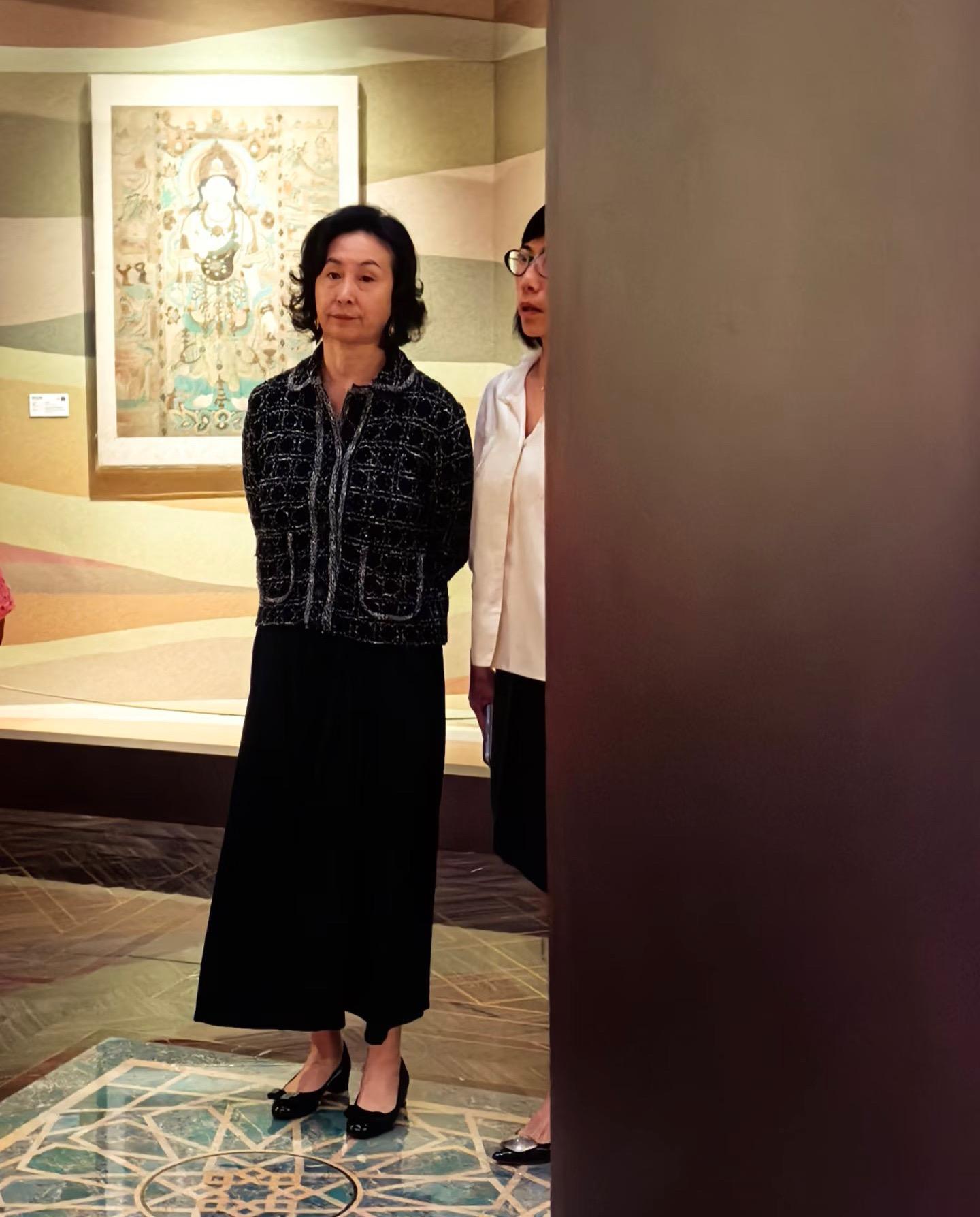 保利美高梅看展的時候,何超瓊也是素面朝天。穿小香風外套、黑色連衣裙,低跟的淺口單鞋。身上散發着文藝範,眼神裏都是故事。