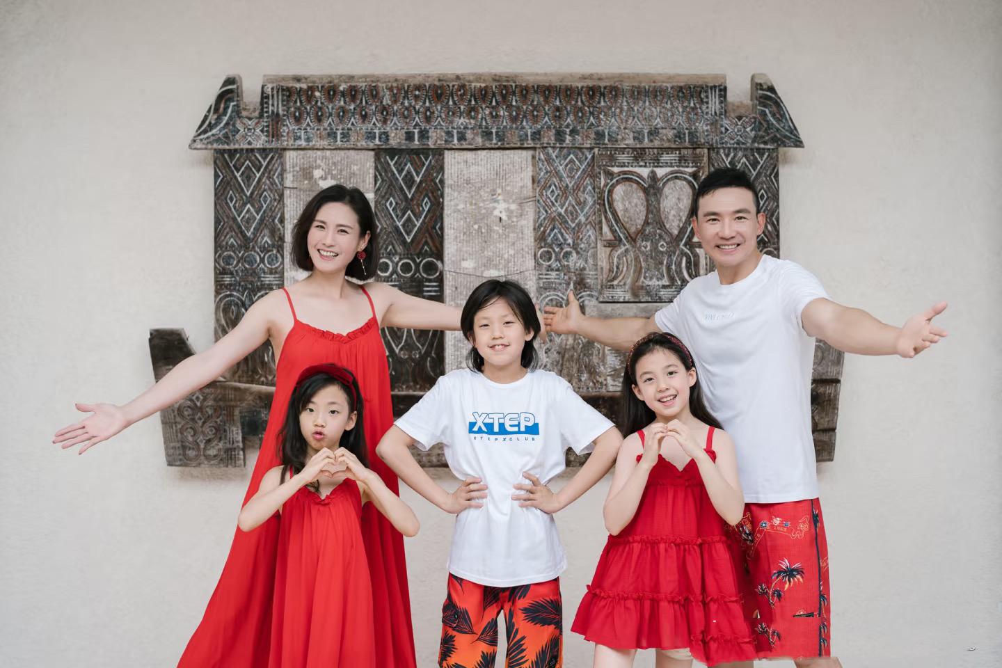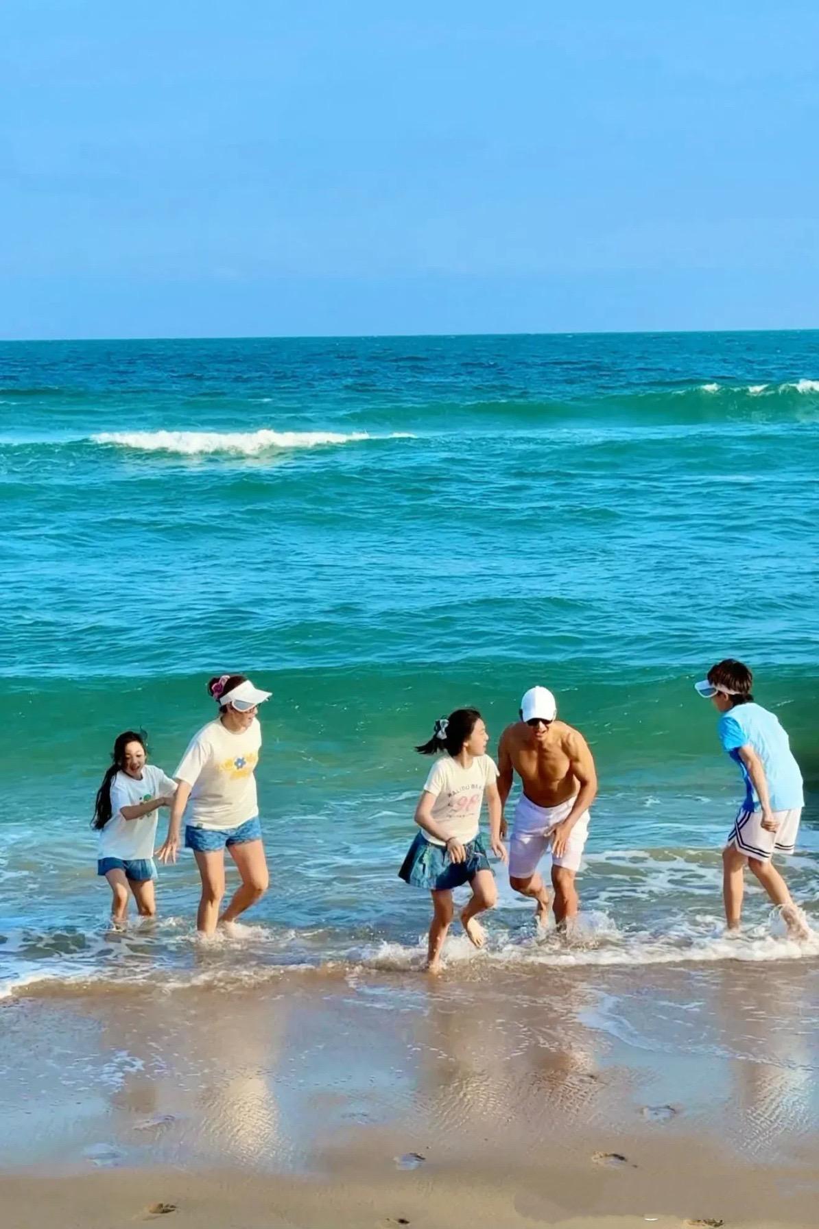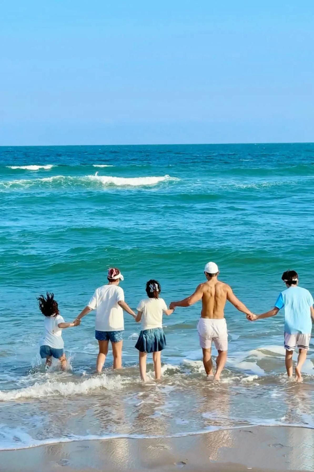 這碧海藍天下,一家人手牽手踏着浪花玩耍。爸爸劉畊宏身材結實,不愧是常年跳操健身的。
