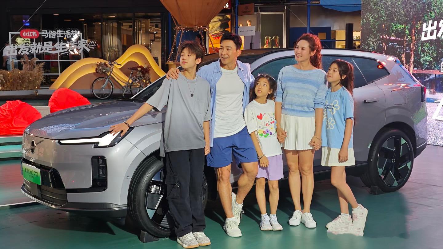 一家人在一起,也非常快樂。他們偶爾會集體出動,拍攝廣告片。小泡芙扎高馬尾,穿藍色T恤、白色短褲,雙腿又細又長。