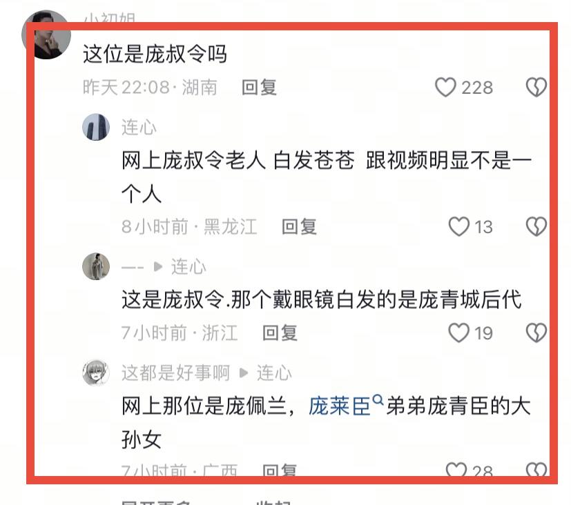 另外網絡上的白髮老人,其實不是龐叔令本人。戴眼鏡的白髮老人是龐青城後代龐佩蘭,也就是龐萊臣陳弟弟龐青城的大孫女。