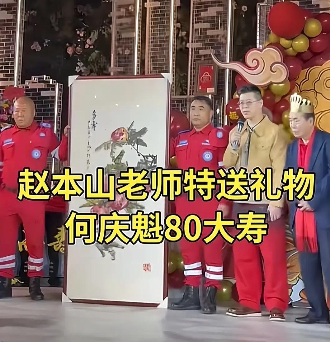 在何慶魁辦80大壽的時候,趙本山特意送來禮物。派去了徒弟李大國還有王老七,送的是一字一畫。